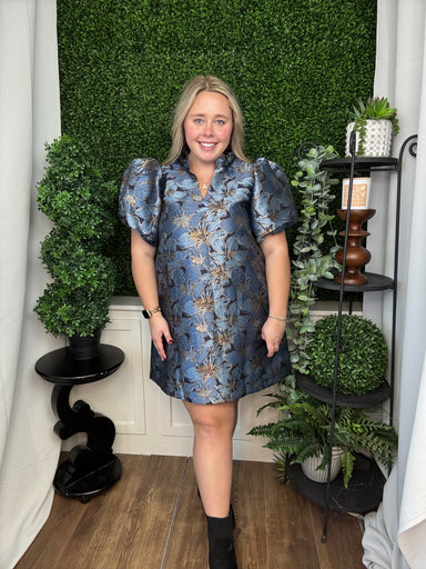 This blue mini dress features an elegant ruffle v-neck and puff sleeves, creating a graceful and refined silhouette. Its delicate details and flatt...