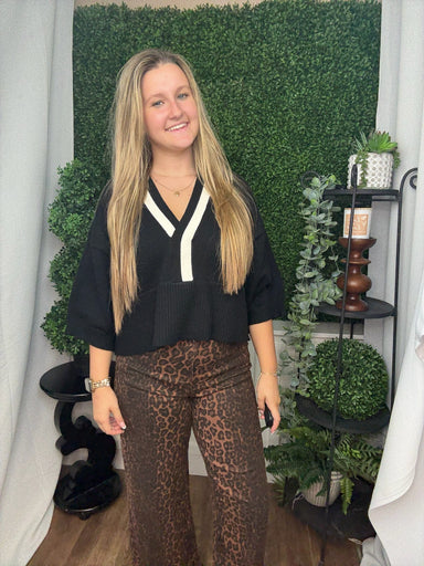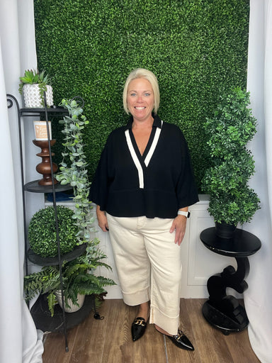 This black v-neck top features elegant color trim detailing for a subtle yet sophisticated touch. Its sleek design and flattering neckline make it ...
