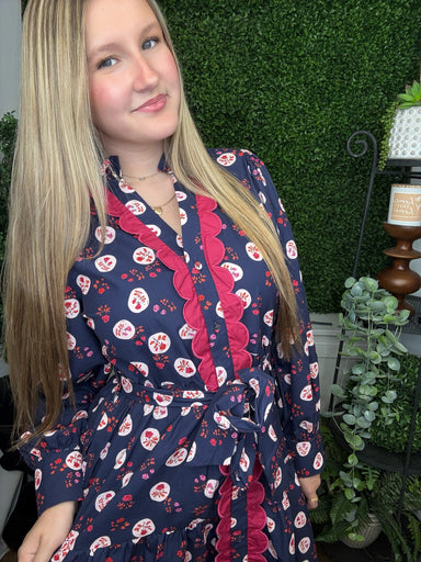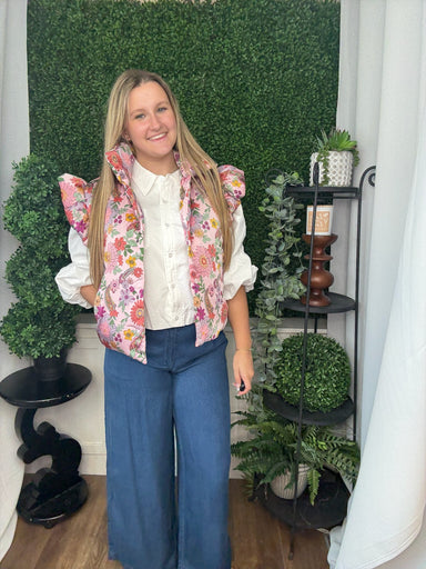 This indigo-pink multi-floral print vest adds a sweet, colorful layer to your fall wardrobe. Its lightweight design makes it perfect for layering o...