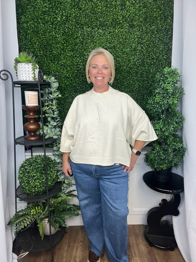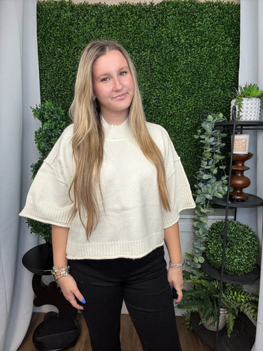 Stay cozy and cute in this marled knit mock neck short sleeve sweater in soft ivory. Its textured knit offers gentle warmth, while the mock neck ad...