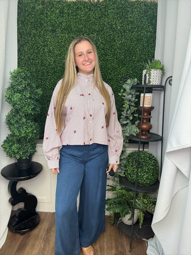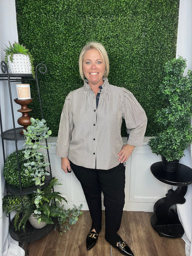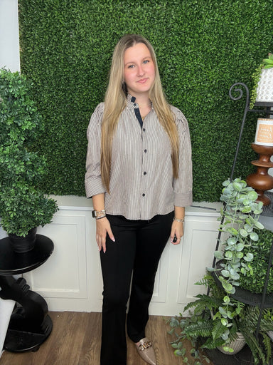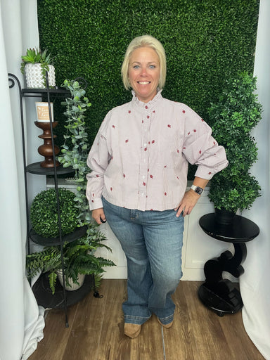 This amber striped button-up top features an embroidered mock neck for a cozy, cute fall look. Its unique detailing and warm tones make it perfect ...