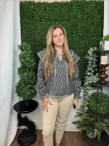 Elevate your look with the Ruffled Neckline Geometrical Print Top in black. The delicate ruffled neckline adds a feminine touch, while the bold geo...