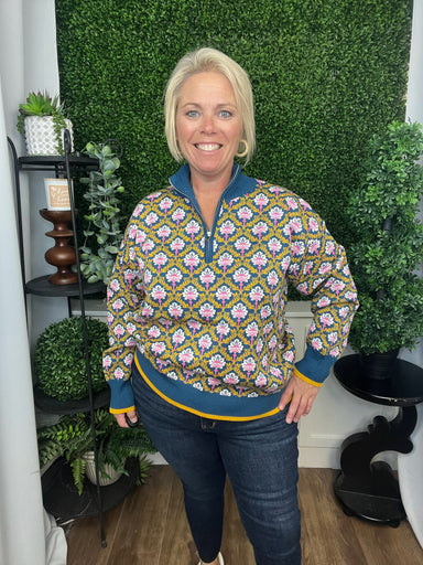 Elevate your wardrobe with this paisley print quilted top in teal, green, and multi floral hues. Featuring delicate lace trim, it offers a refined ...