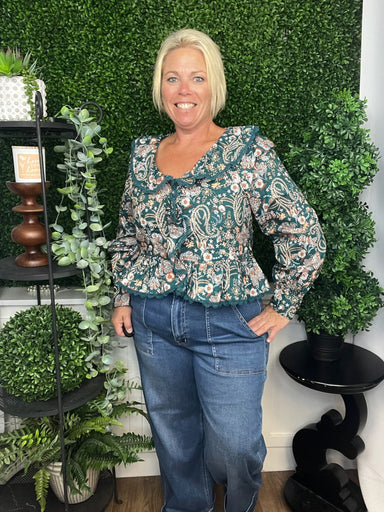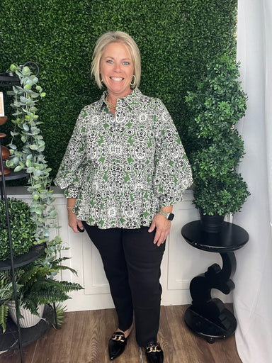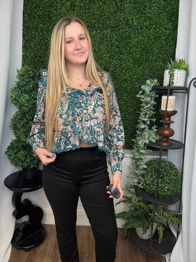 This green button-down boho floral peplum top combines charming floral prints with a flattering peplum silhouette. Its breezy fit and earthy tones ...