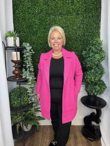 Elevate your wardrobe with this long sleeve open front sweater coat in a vibrant raspberry pink. Its soft, cozy knit drapes elegantly, offering a f...
