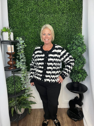 This long sleeve cardigan sweater features a classic black and white stripe pattern that adds timeless elegance to your look. Its tailored fit and ...