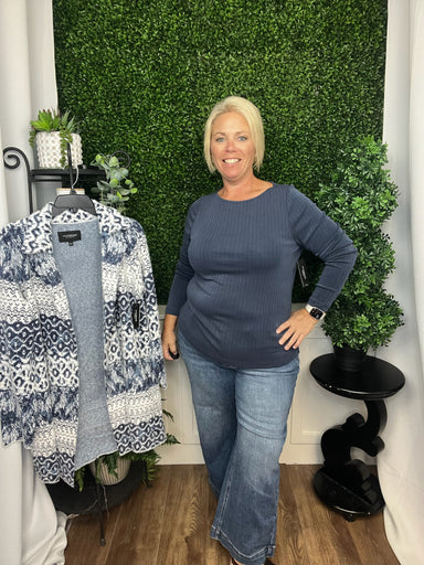 This Long Sleeve Boat Neck Knit Top in washed navy offers a refined silhouette with its elegant neckline and smooth knit fabric. Designed to provid...