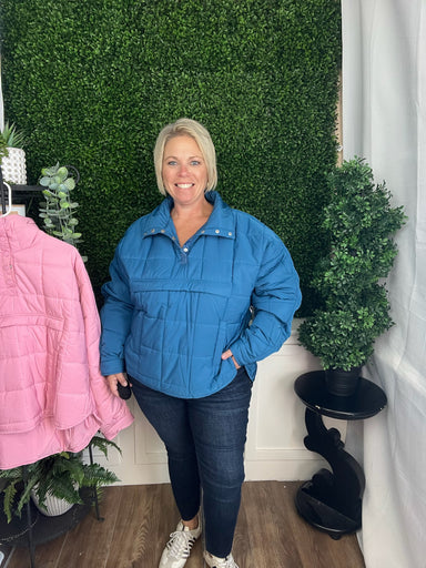 This light pink puffer pullover jacket combines warmth and style with its cozy insulation and easy pullover design. Its soft color and trendy silho...