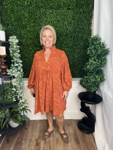 This rust jacquard dress features a high ruffle neck, combining intricate texture with elegant design for a refined, dressy look. Its flattering si...