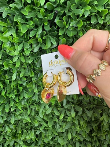 JANE MARIE18k gold plated tubular hoop w/starburst heart & fuchsia crystal earrings