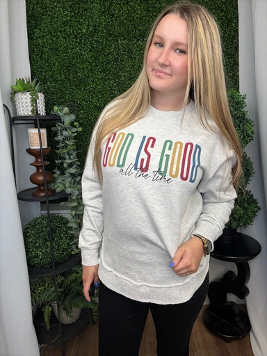 Stay cozy and inspired with the God Is Good long sleeve crewneck in a soft oatmeal hue. This casual, comfortable sweatshirt features a heartfelt me...