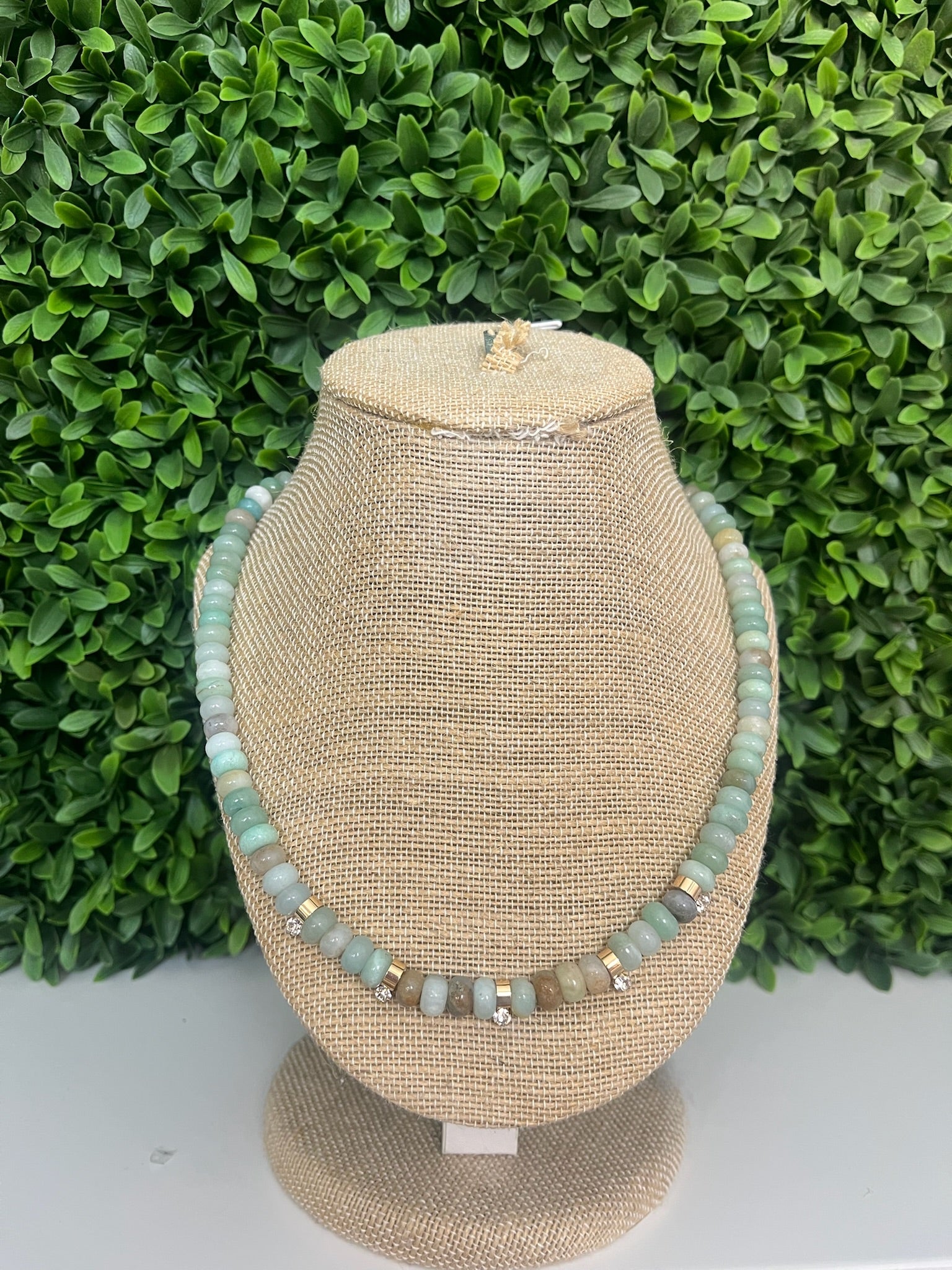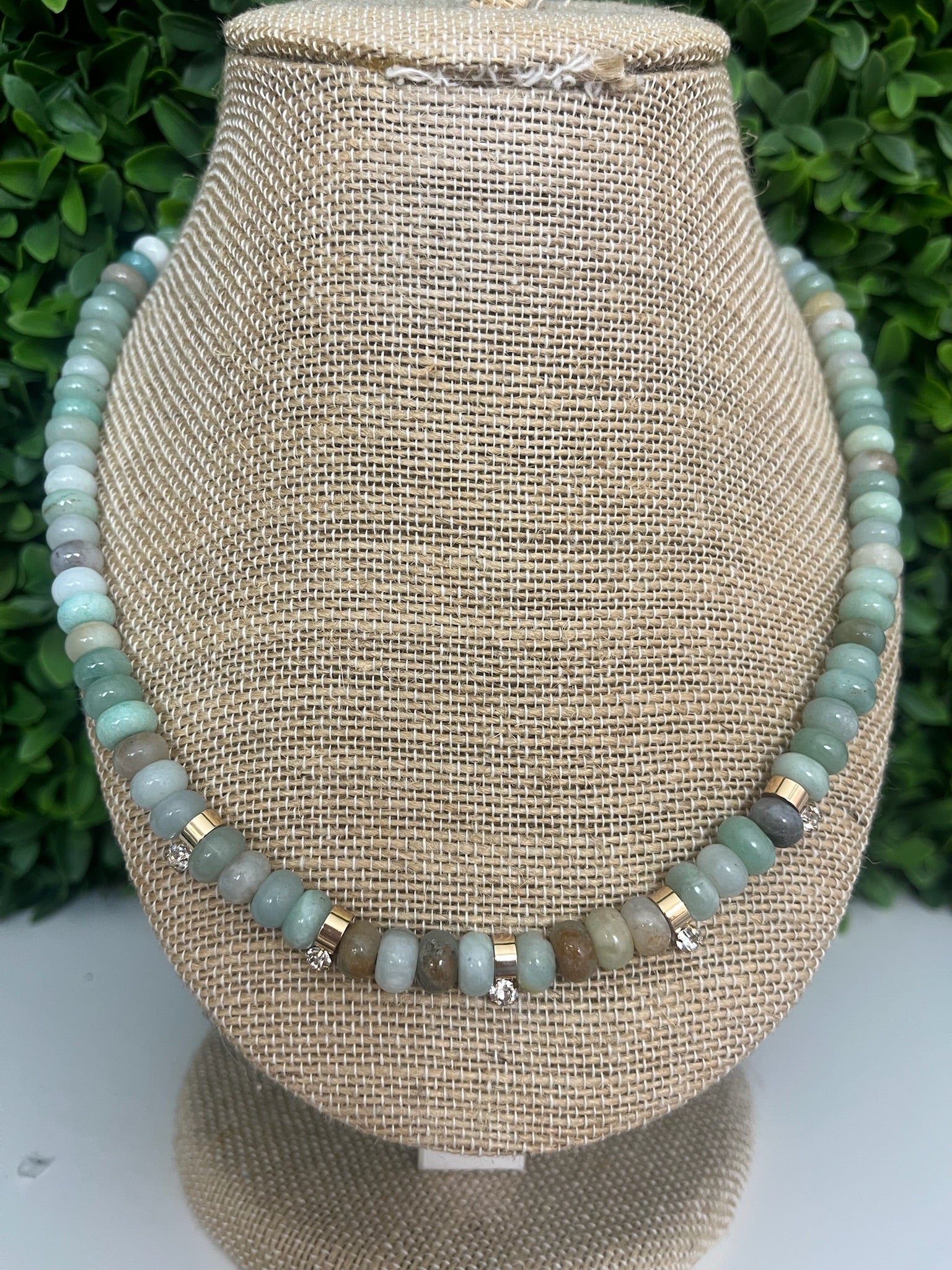 16" gold cylinder disc beads w/crystal drop stations necklace