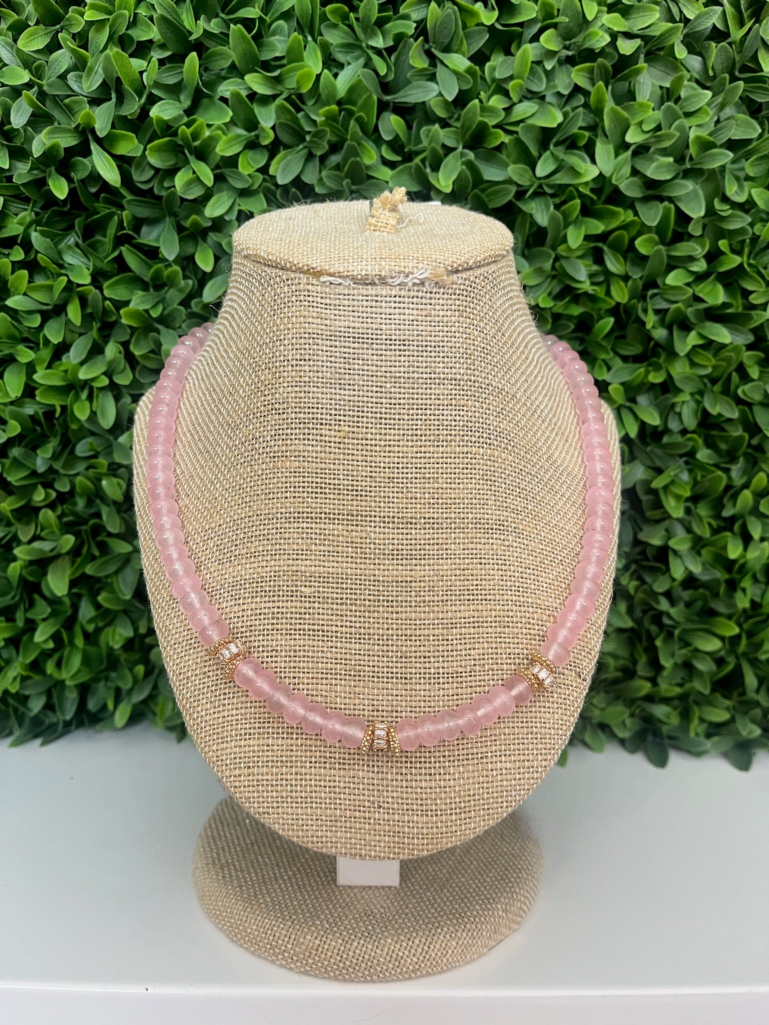 The 16" Rose Beads Necklace with Gold and Crystal Clusters features a delicate combination of soft rose-colored beads accented by shimmering gold and sparkling crystal clusters. This elegant piece adds a touch of romantic sophistication, perfect for elevating both everyday looks and special occasions.