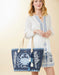 The best party is a beach party and our Fiesta Tote is always ready to come along! Decorated with an embroidered crab on a cotton and jute blend, this tote features a fun, tiered tassel fob and a faux leather bottom base to keep it dry. The custom, crosshatch patterned cotton interior features two slip pockets and one hanging zipper pocket.