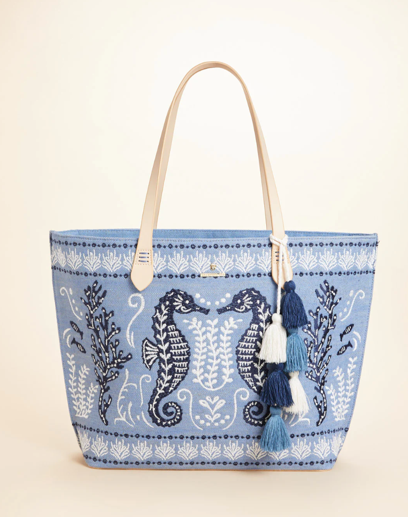 The best party is a beach party and our Fiesta Tote is always ready to come along! Decorated with an embroidered seahorse on a cotton and jute blend, this tote features a fun, tiered tassel fob and a faux leather bottom base to keep it dry. The custom, crosshatch patterned cotton interior features two slip pockets and one hanging zipper pocket.