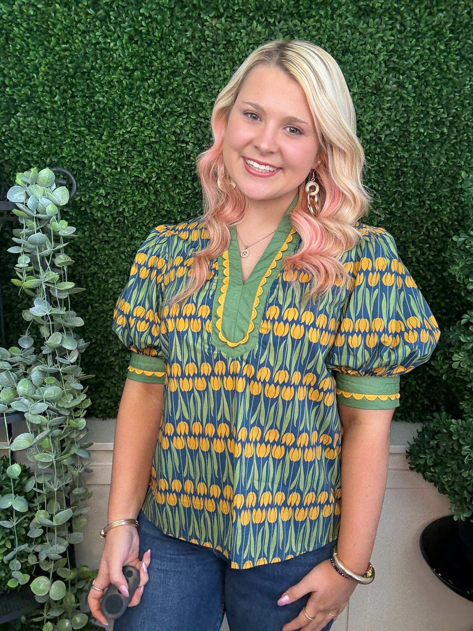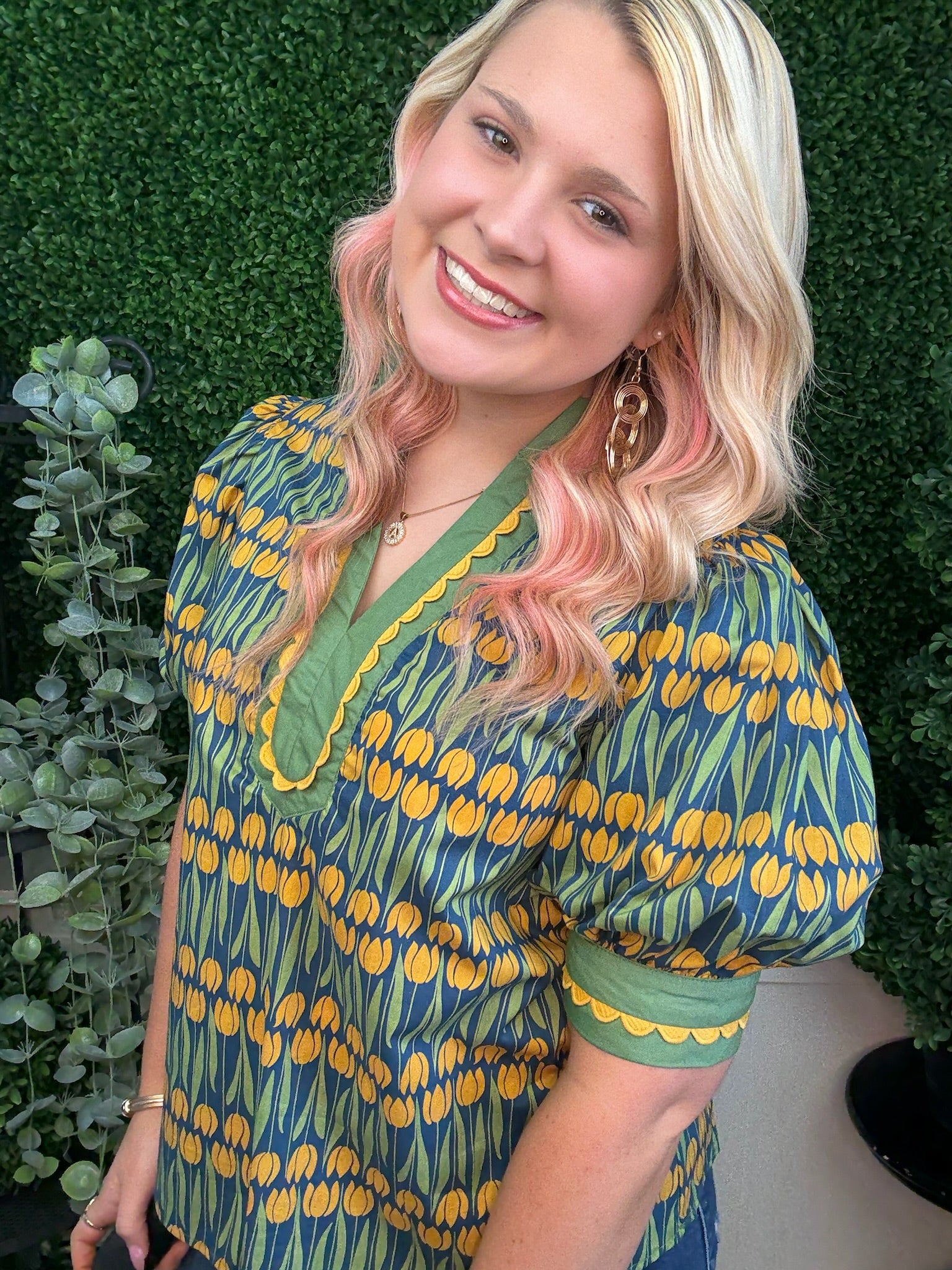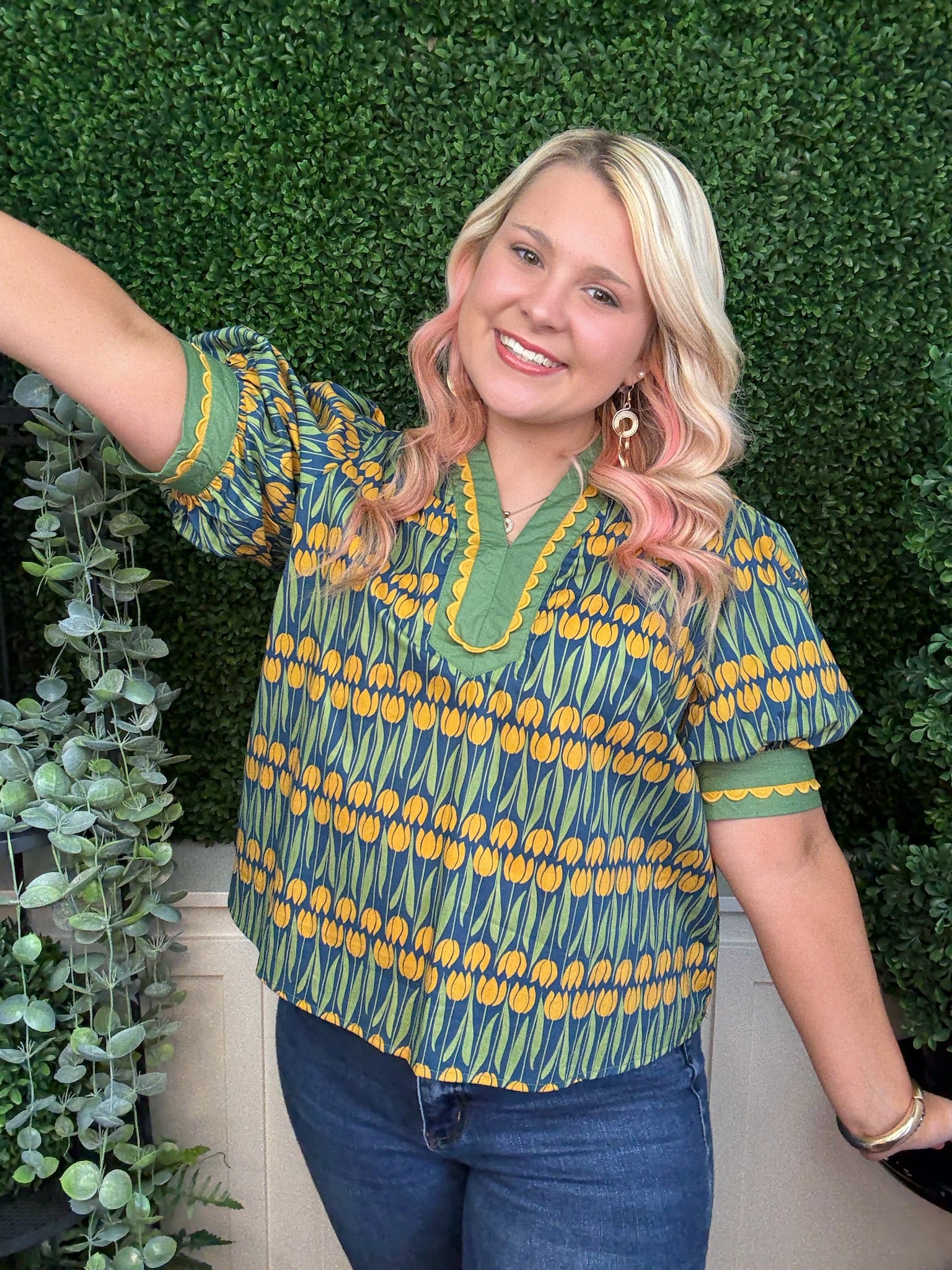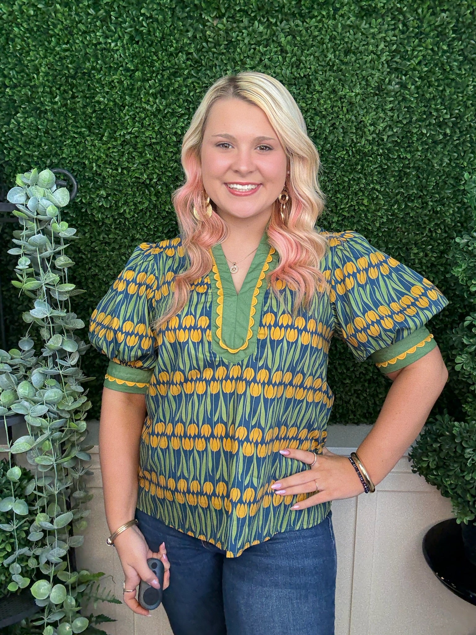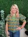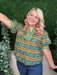 The Floral Pattern Cuff Band Short Sleeve Top in Teal is a cute fall piece featuring charming floral details and stylish cuffed sleeves. Its rich teal color adds warmth and vibrancy, perfect for layering during the cooler season.