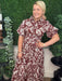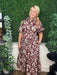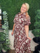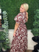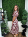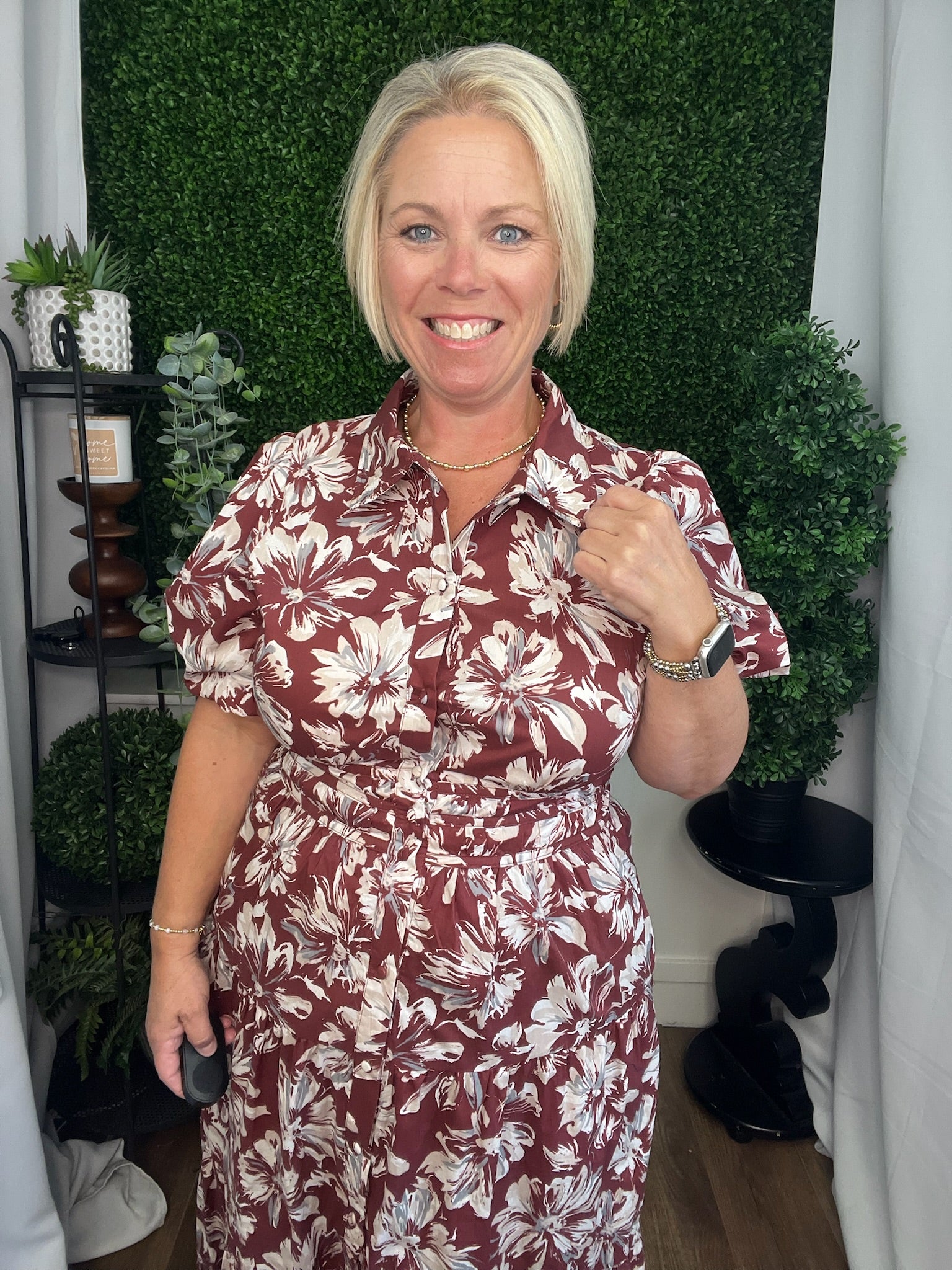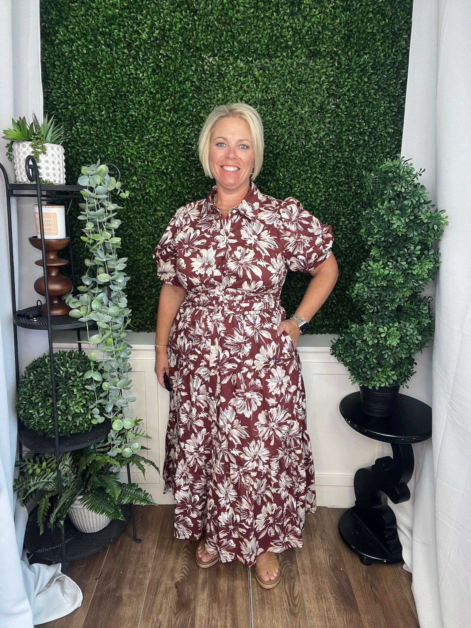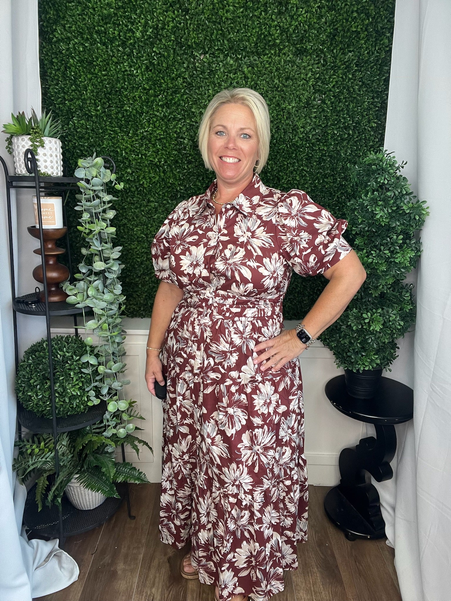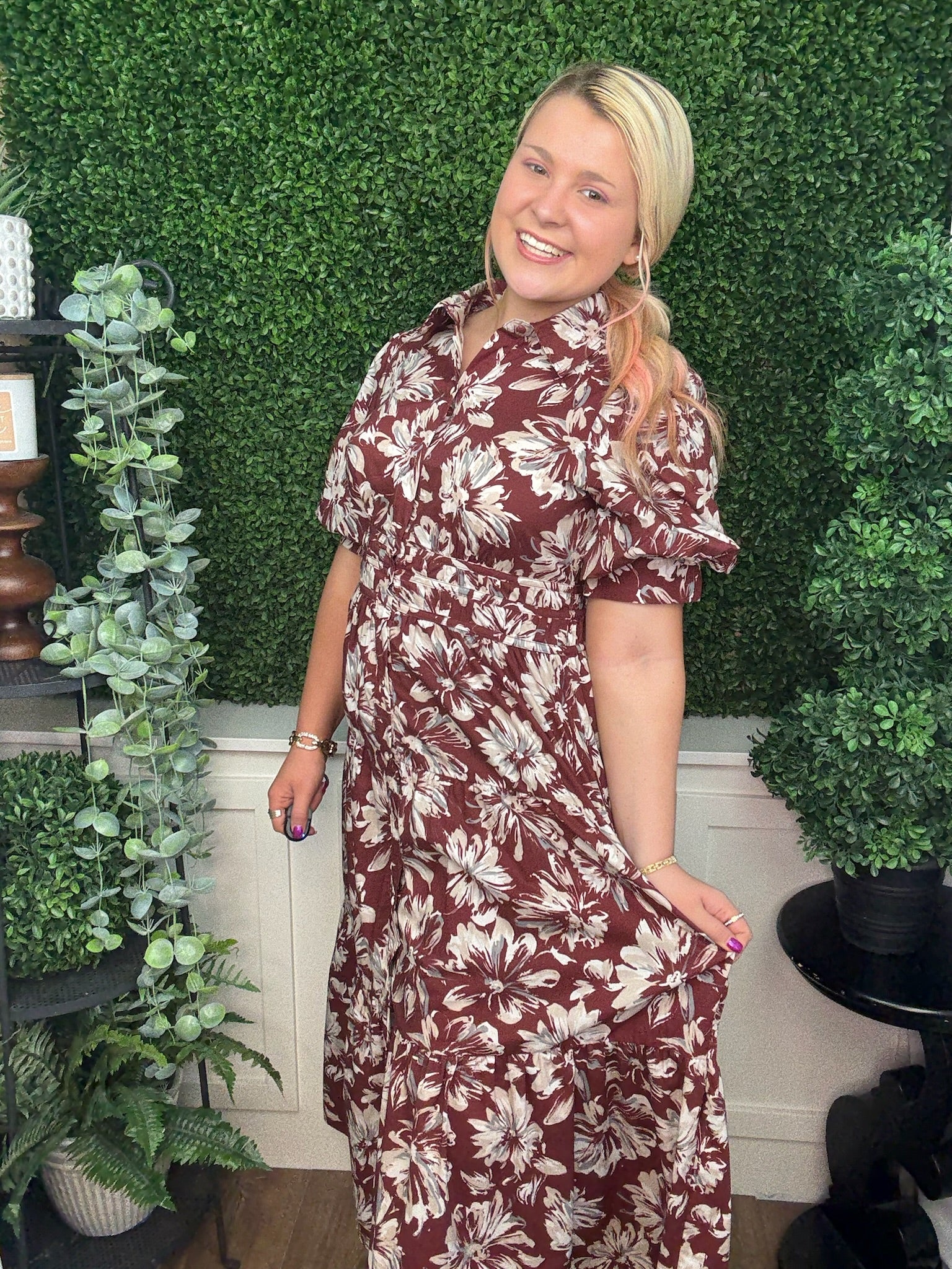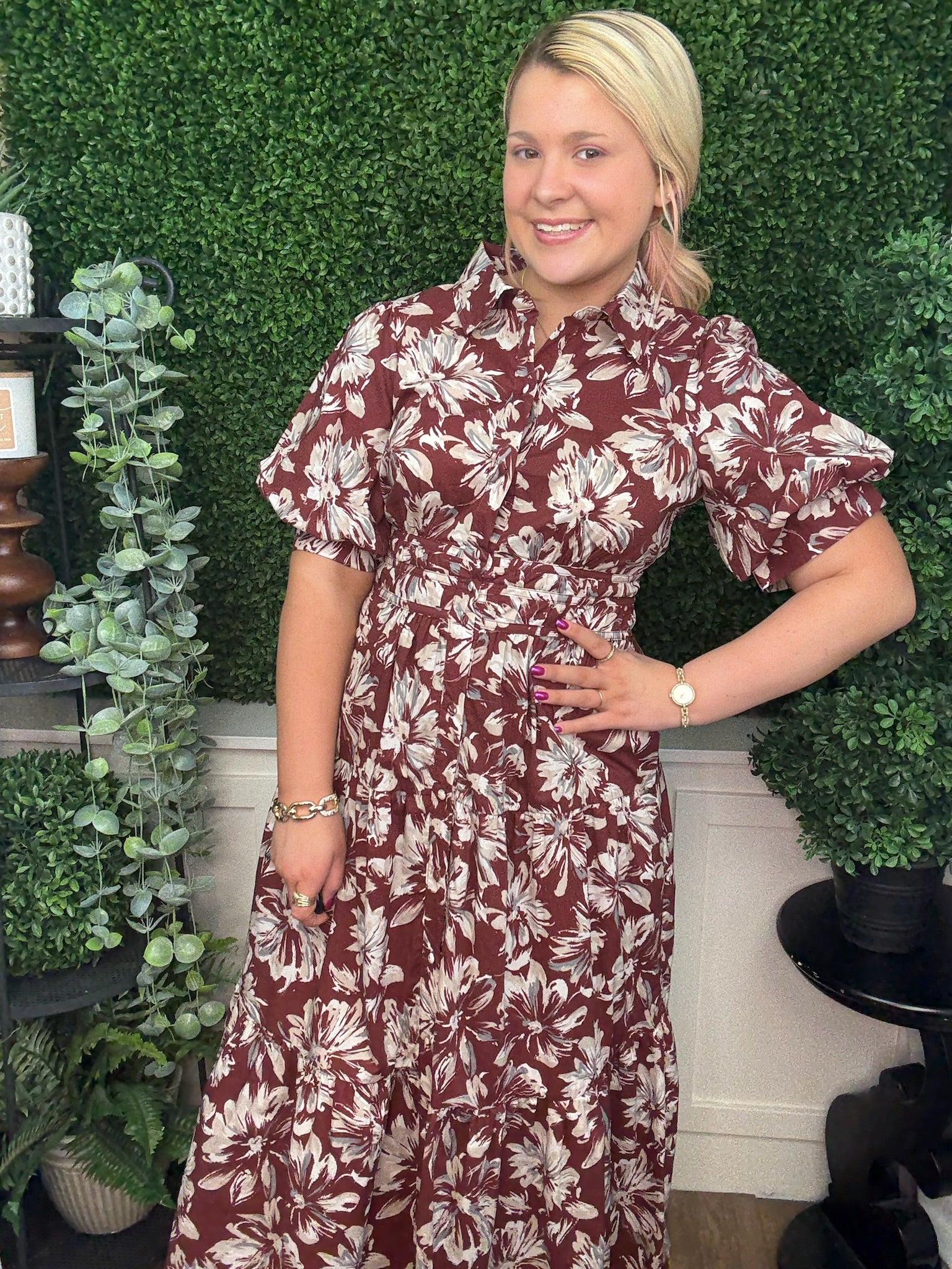 This wine-colored midi dress features a charming floral pattern and puff sleeves with cuff bands, creating a cute and stylish look. Its flattering silhouette and delicate details make it perfect for both casual outings and special occasions, adding a touch of elegance to your wardrobe.