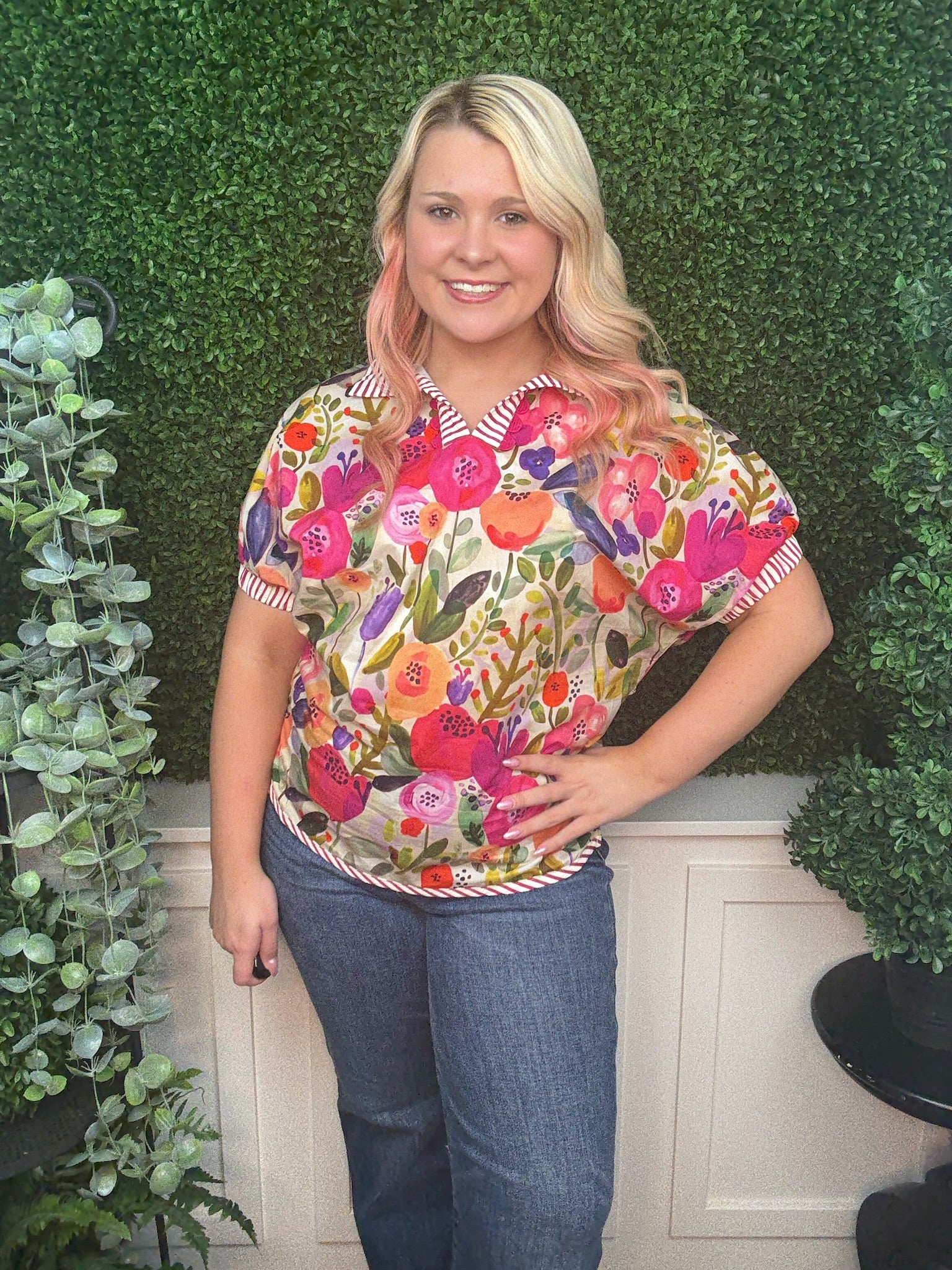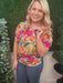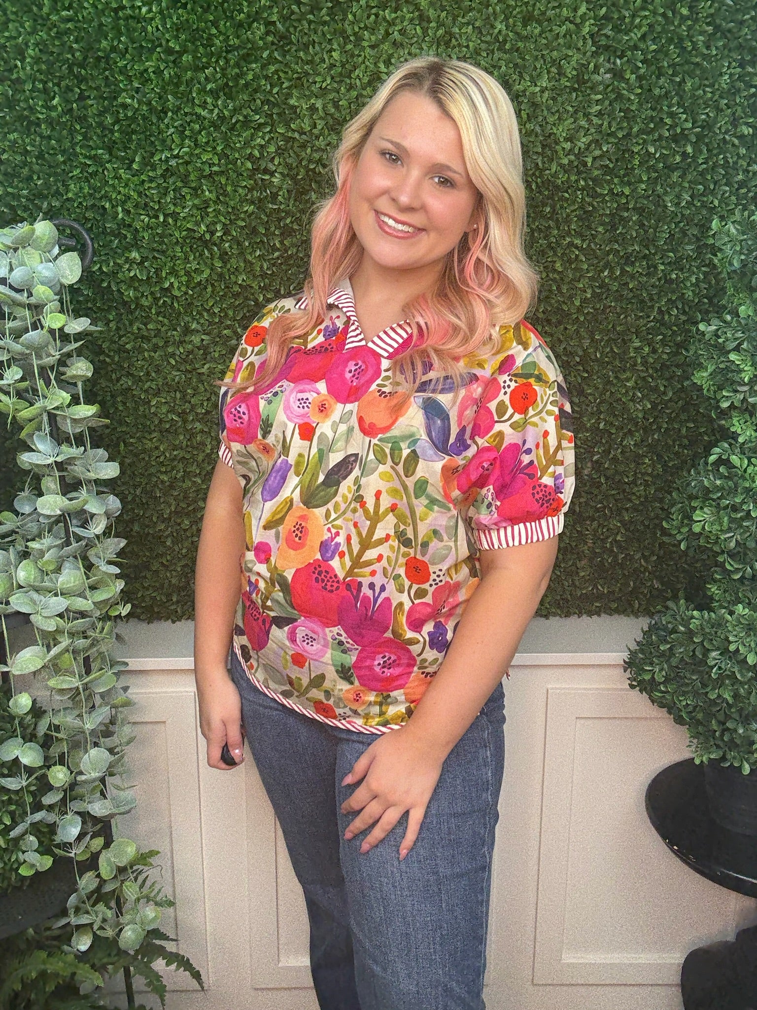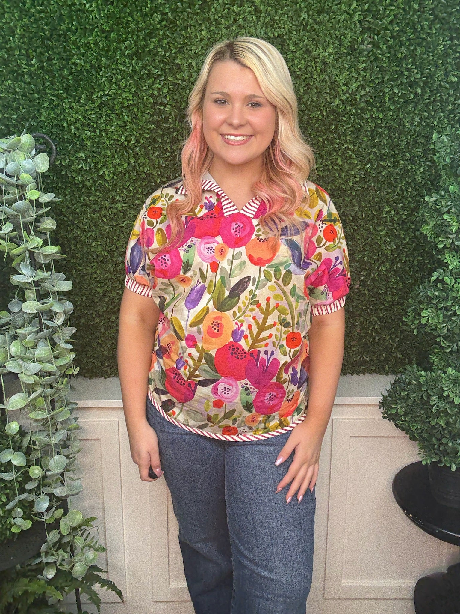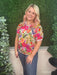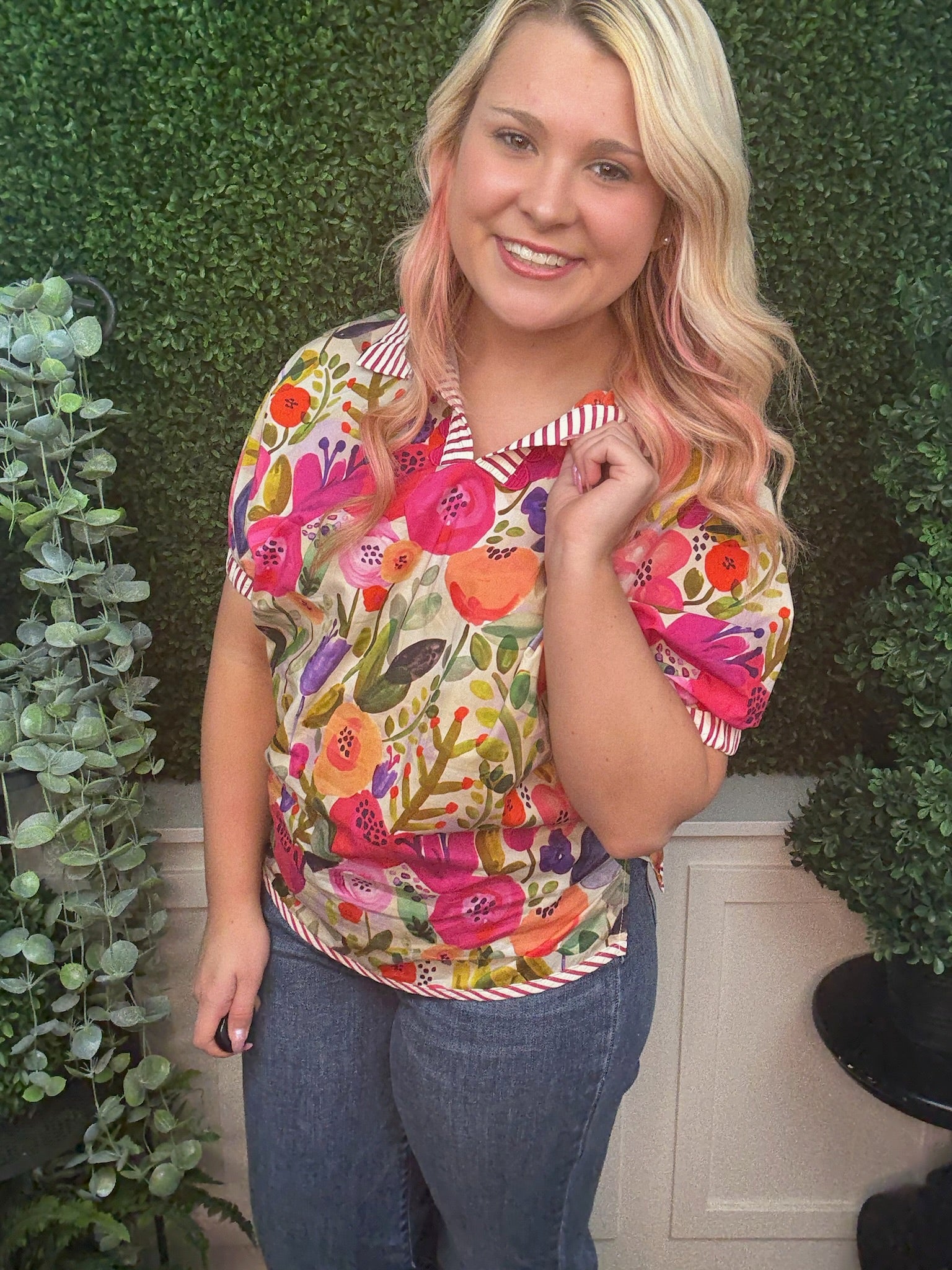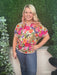 Brighten your wardrobe with this Floral Mock-Neck Top in a lively fuchsia mix. Its playful floral pattern and flattering mock-neck design add a charming touch to any outfit. Perfect for adding a pop of color and a cute, fresh vibe to your everyday look.