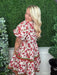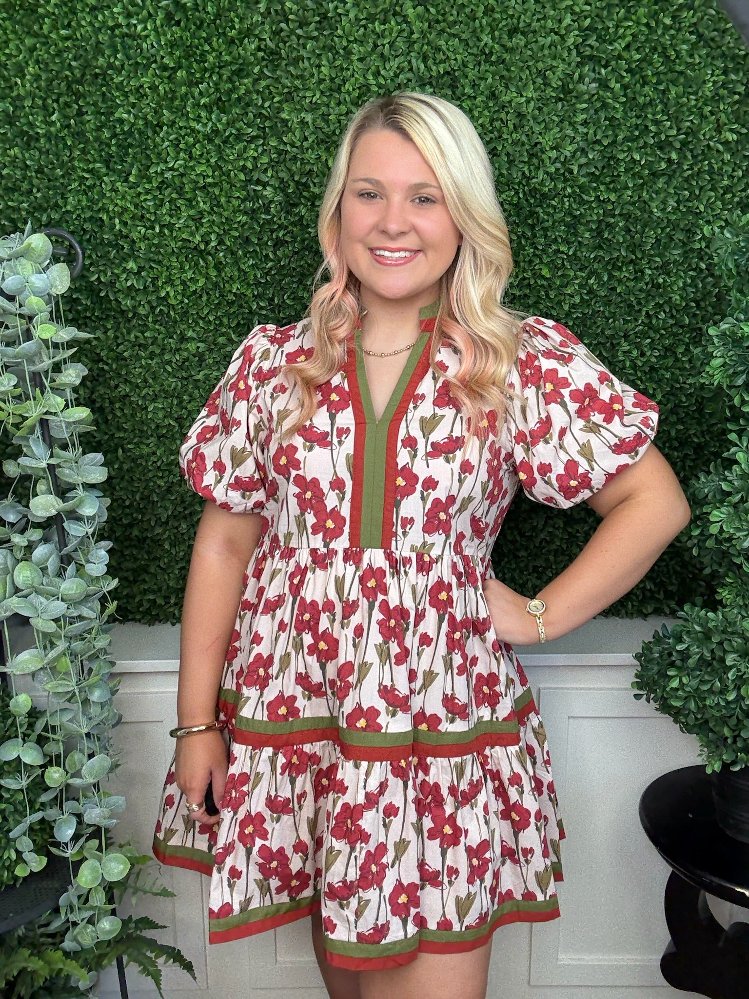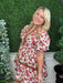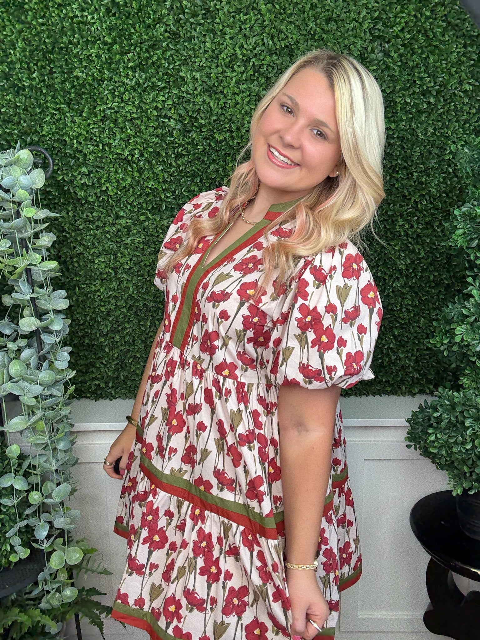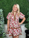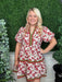 This rust-colored mini dress features a charming floral print and short bubble sleeves that add a playful touch. Its pullover design and tiered silhouette create a flattering, easy-to-wear look perfect for casual outings or special occasions. Embrace a cute and stylish vibe with this effortlessly feminine piece.