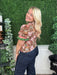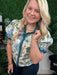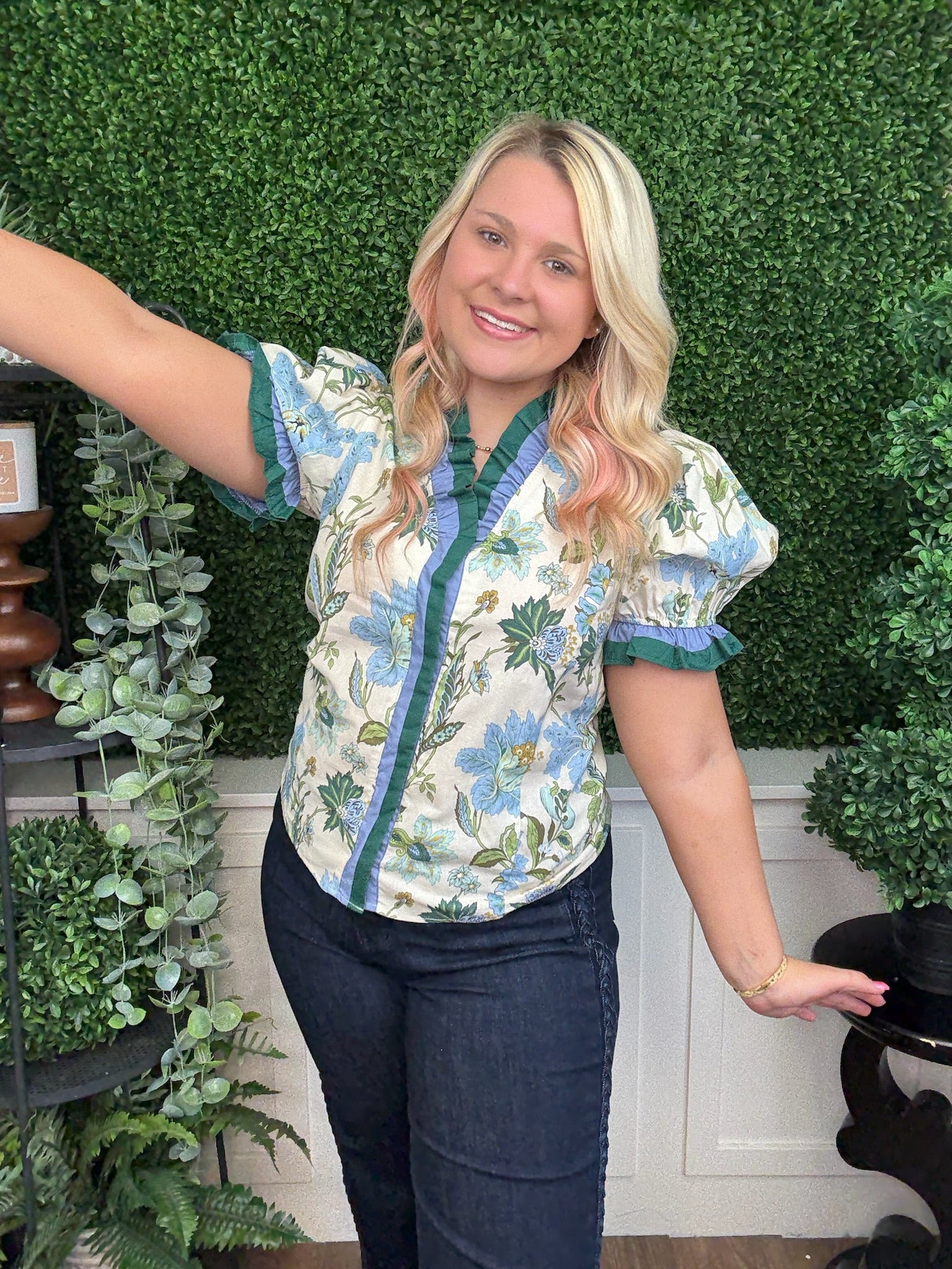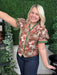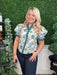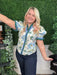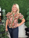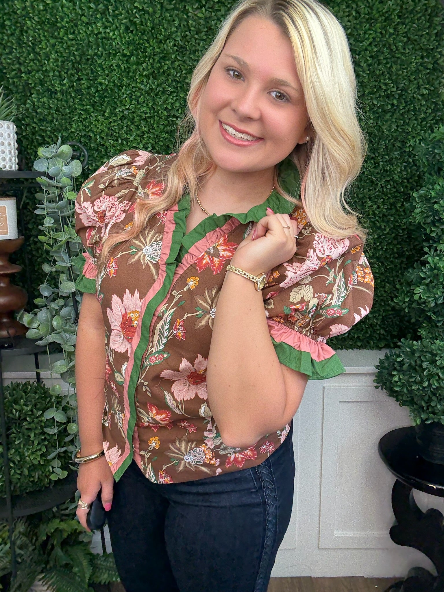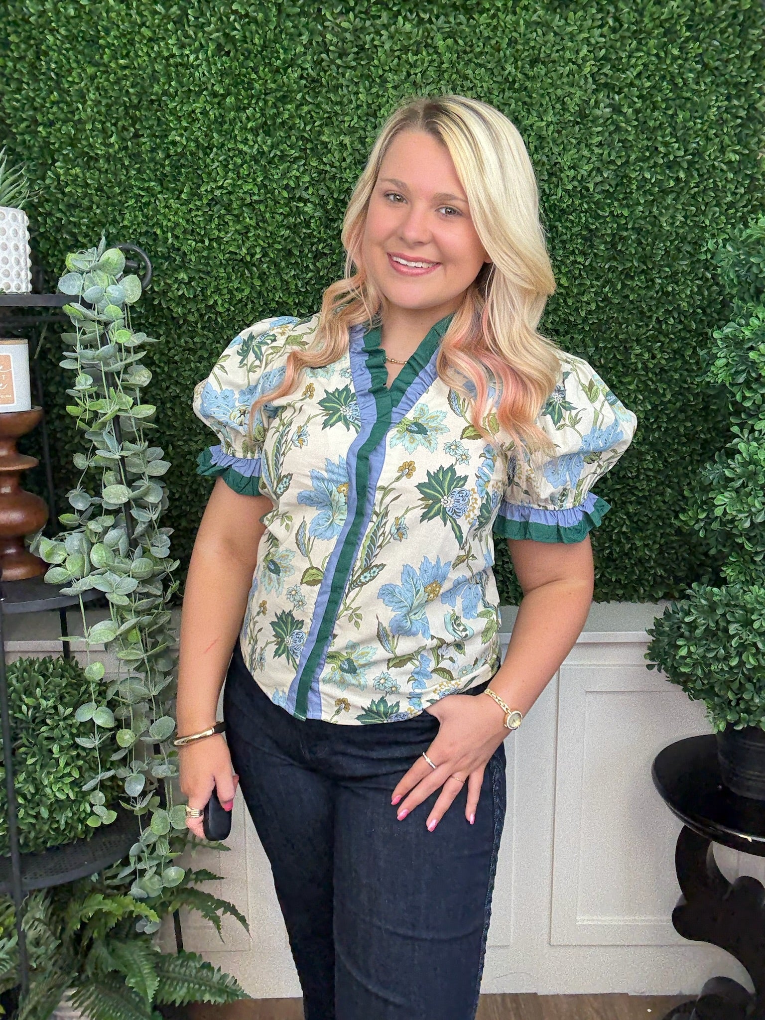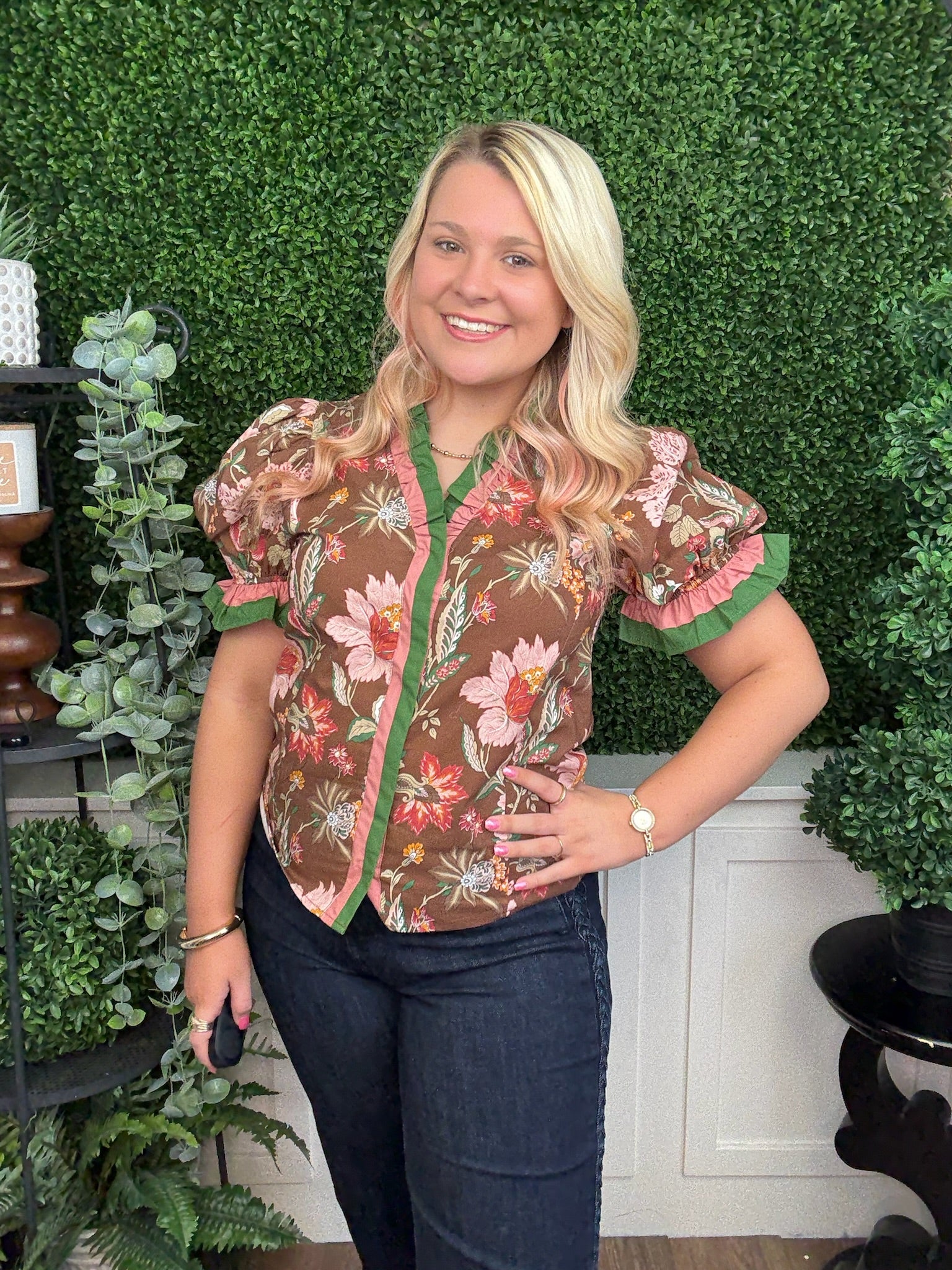 floral print shoulder puff sleeve top w/accent ruffle band