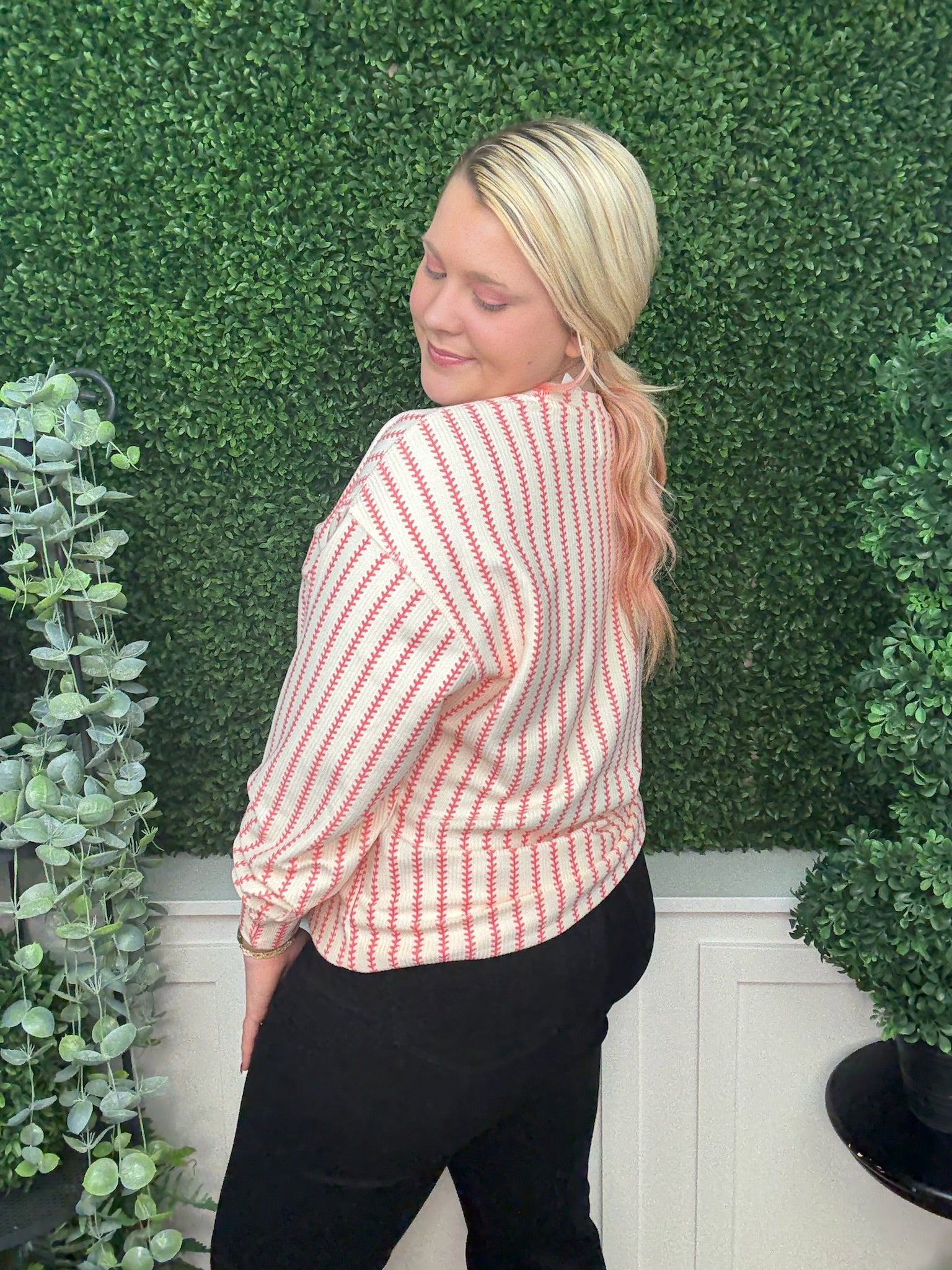 This ivory crewneck sweatshirt features a playful baseball stitch print, perfect for showing off your game day spirit in a cute and casual way. Its soft fabric and relaxed fit make it a cozy choice for cheering on your favorite team or everyday wear.