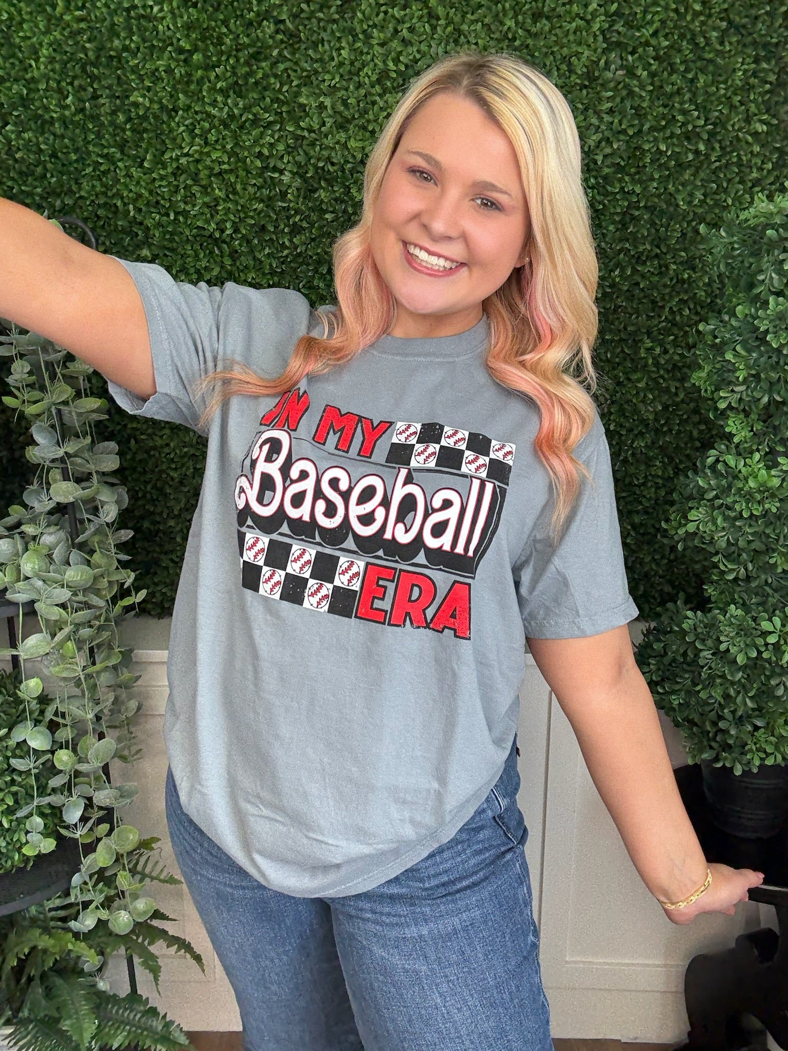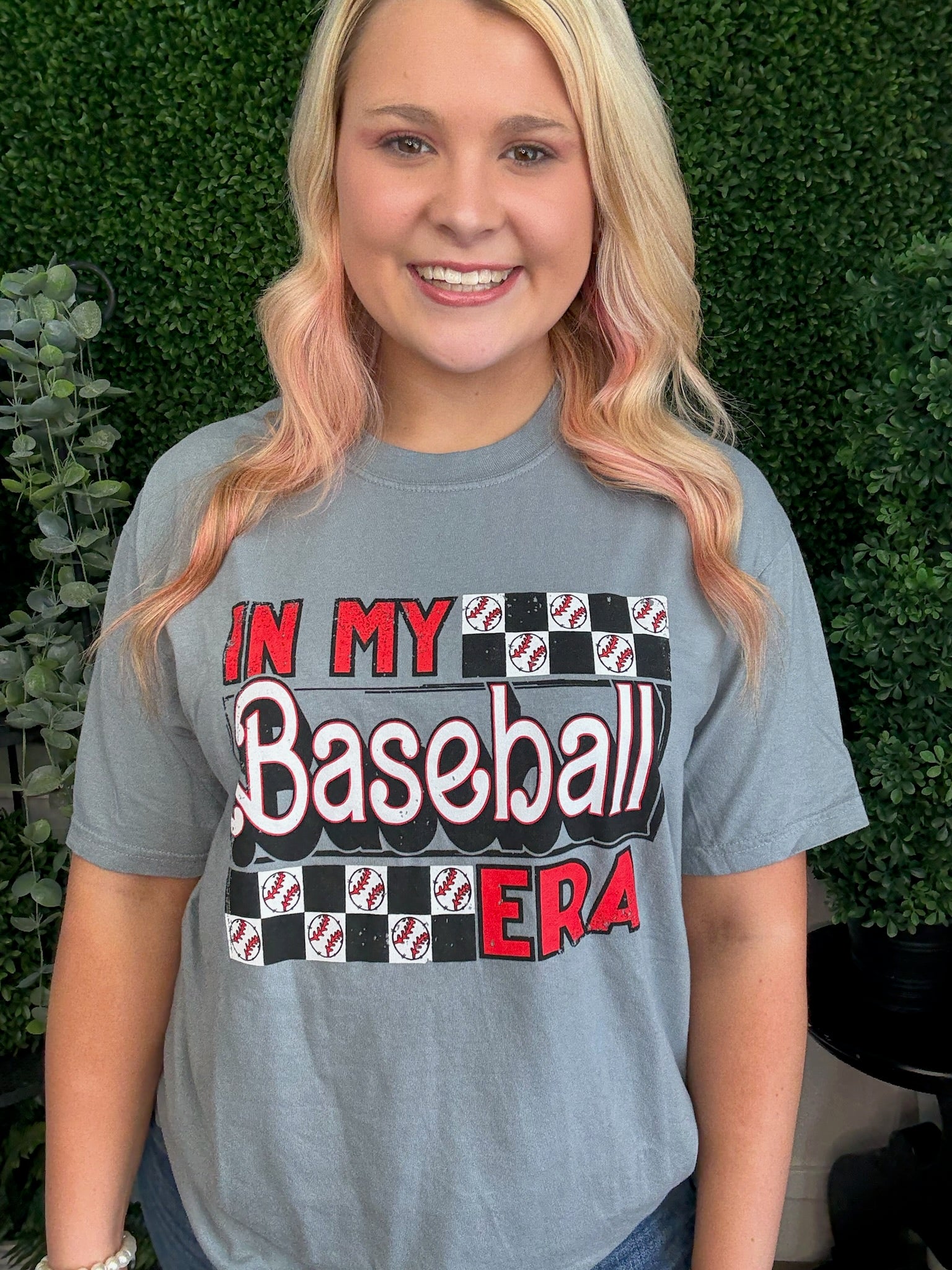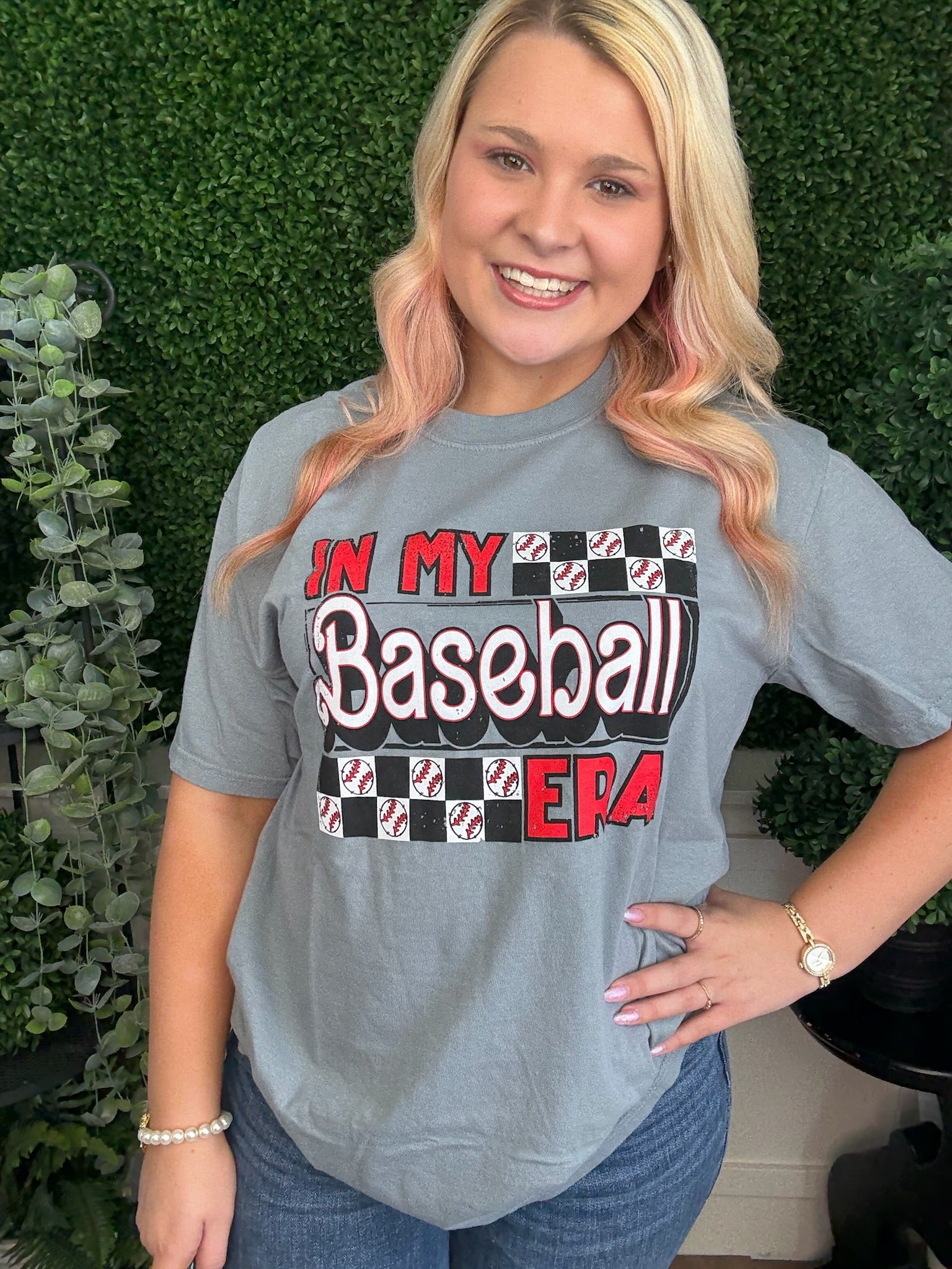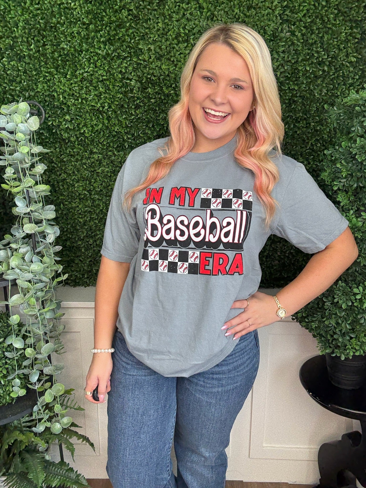 Celebrate your love for the game with this grey "In My Baseball Era" short sleeve tee. Its soft fabric and simple design make it a cute and comfortable choice for any baseball fan ready to show off their passion.