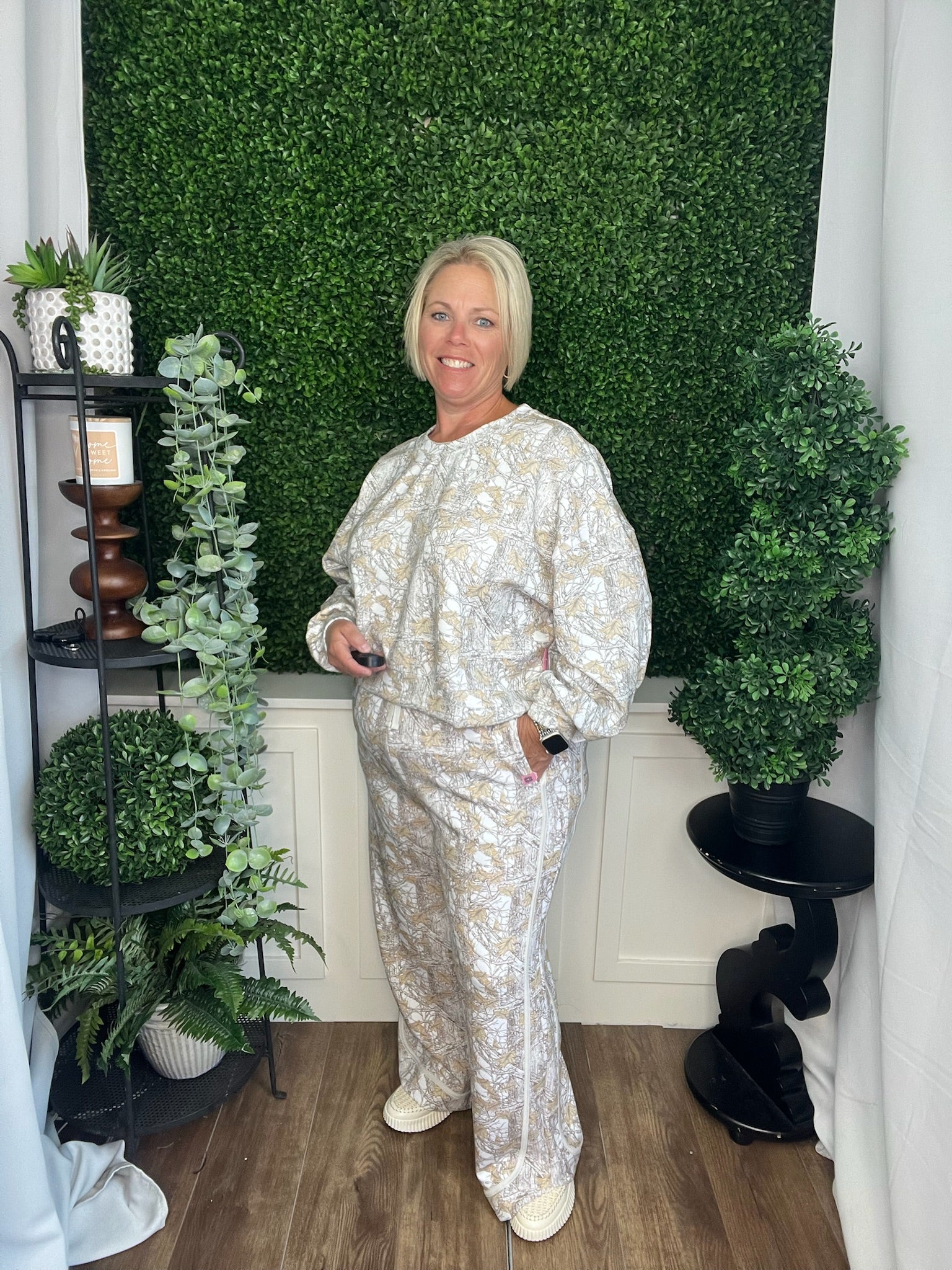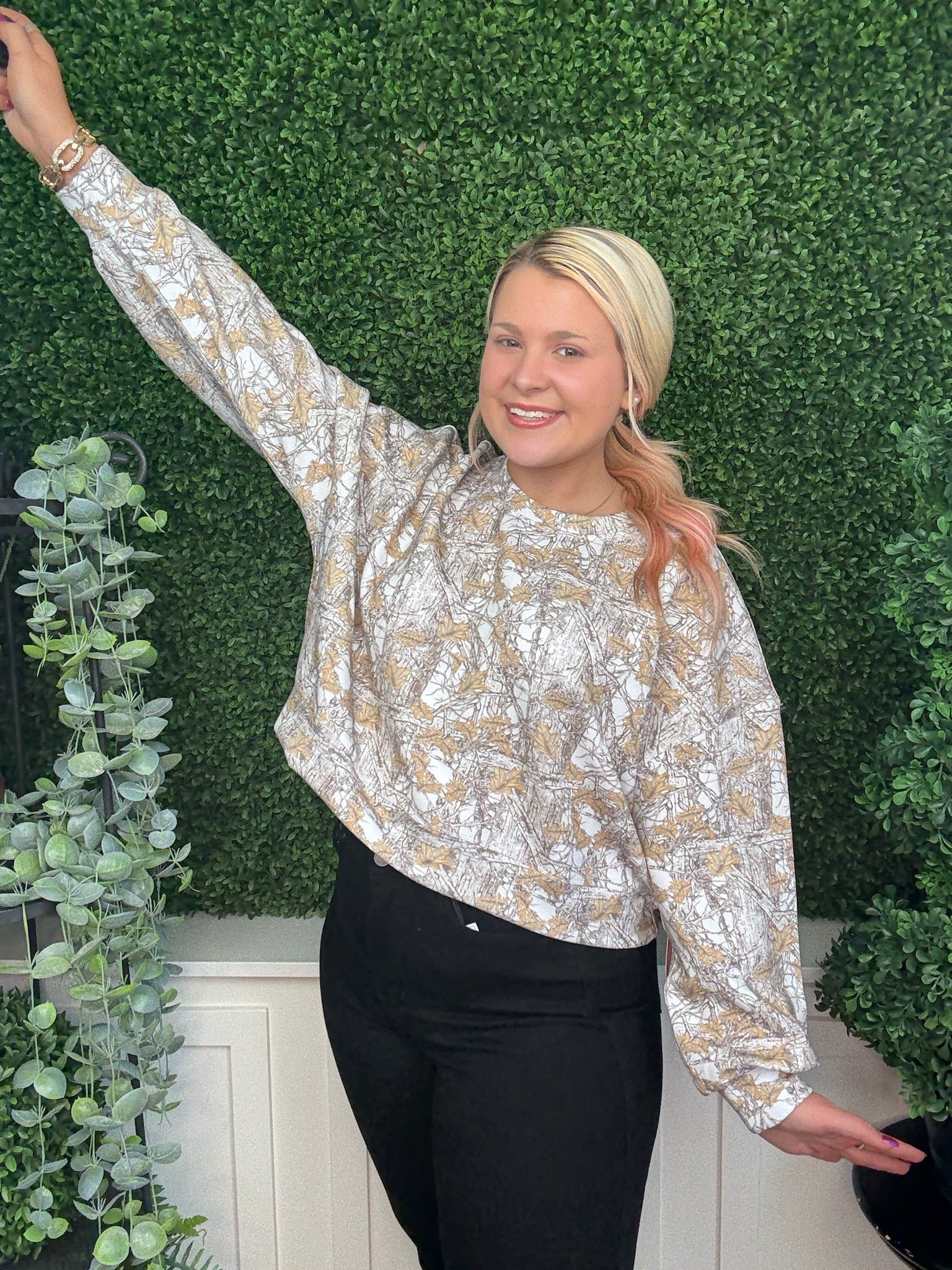 The Laney Pullover in camo white combines a trendy camouflage pattern with a comfortable, casual fit. Perfect for everyday wear, this pullover offers cozy warmth and effortless style for relaxed outings or layering on cooler days.