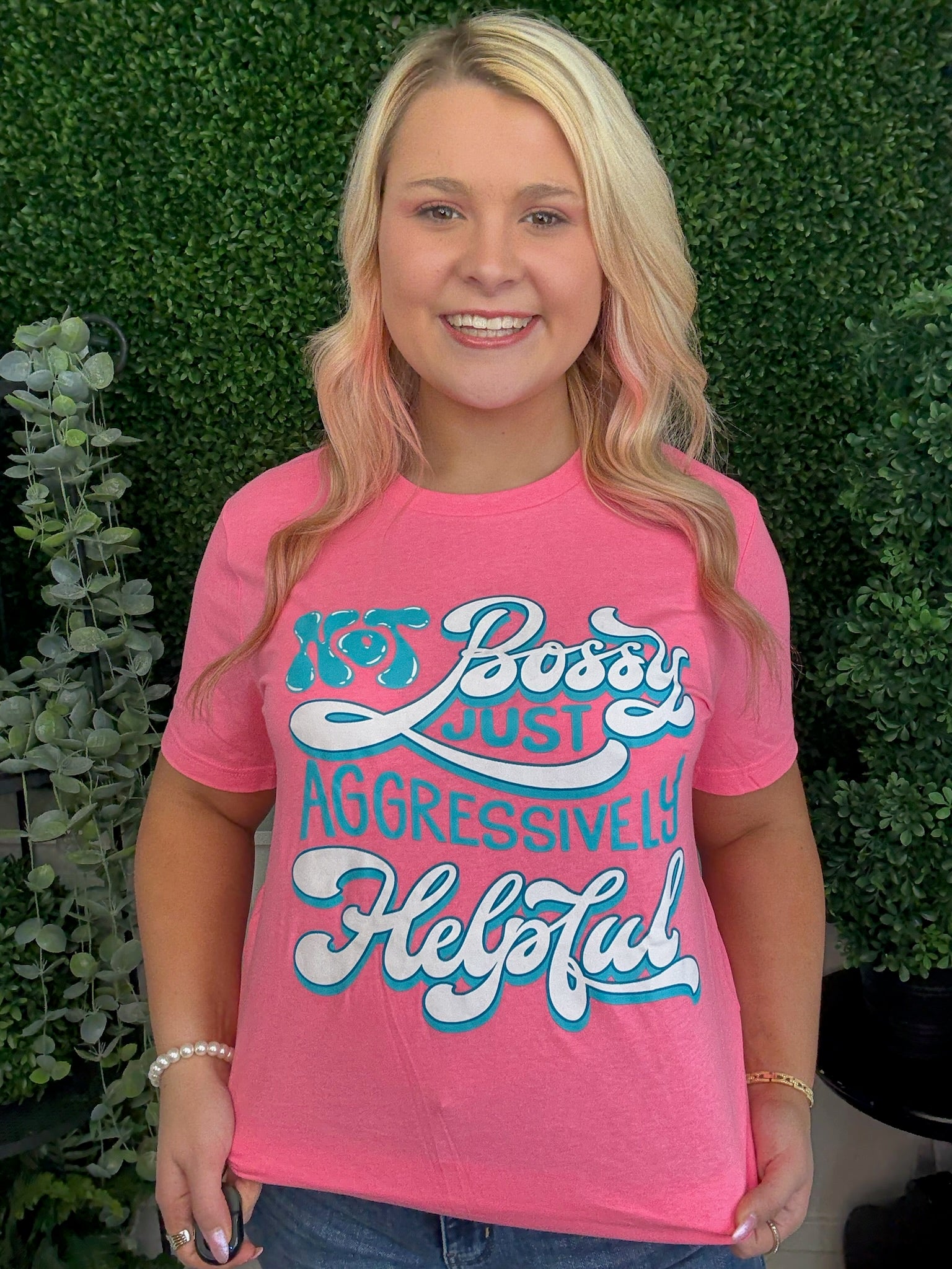 This pink "Not Bossy Just Aggressively Helpful" short sleeve tee combines a playful message with a soft, comfortable fit. It’s a cute and simple way to show your confident, helpful spirit every day.