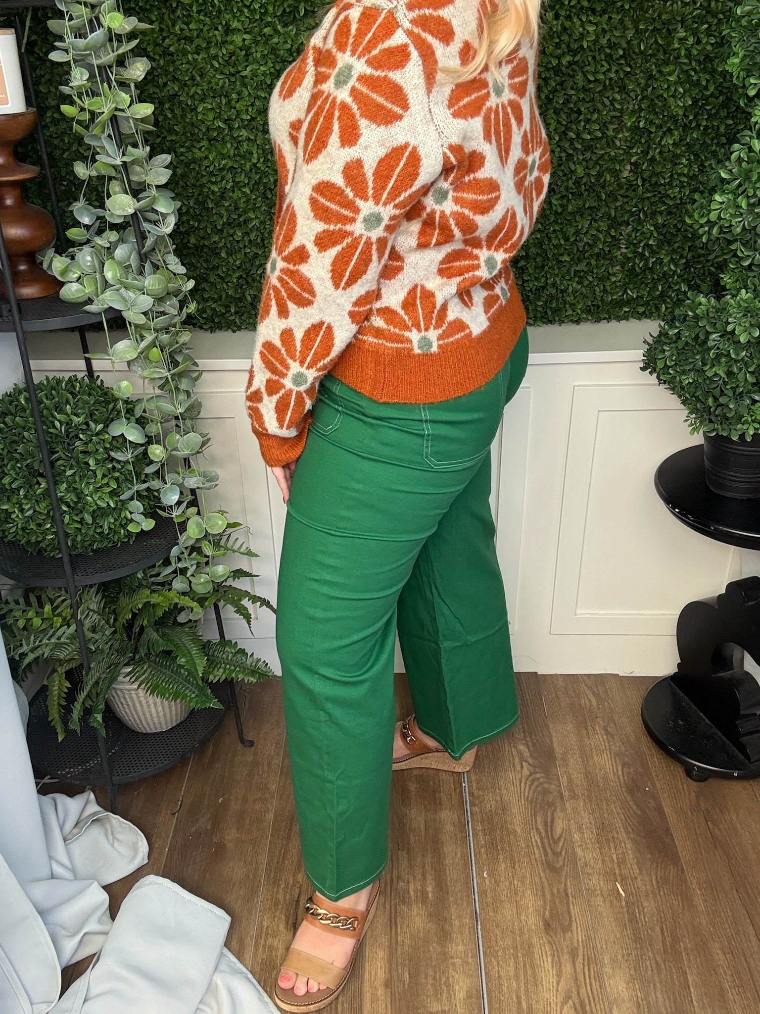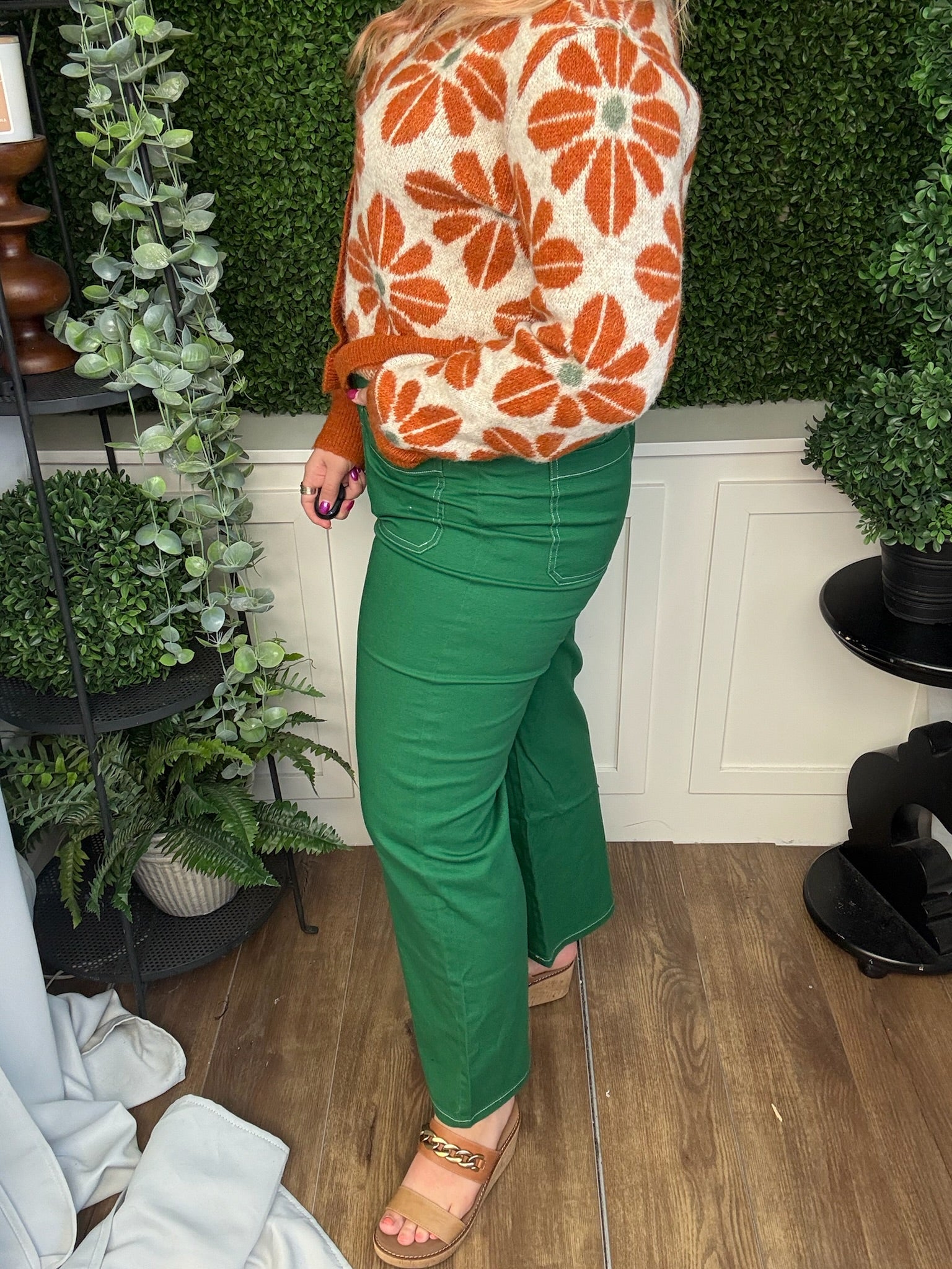 Elevate your style with these Solid High-Waist Pants in Emerald, featuring eye-catching exposed stitch details. The high waist offers a flattering fit, while the vibrant color adds a cute and stylish pop to any outfit. Perfect for dressing up or down with ease.