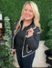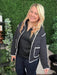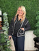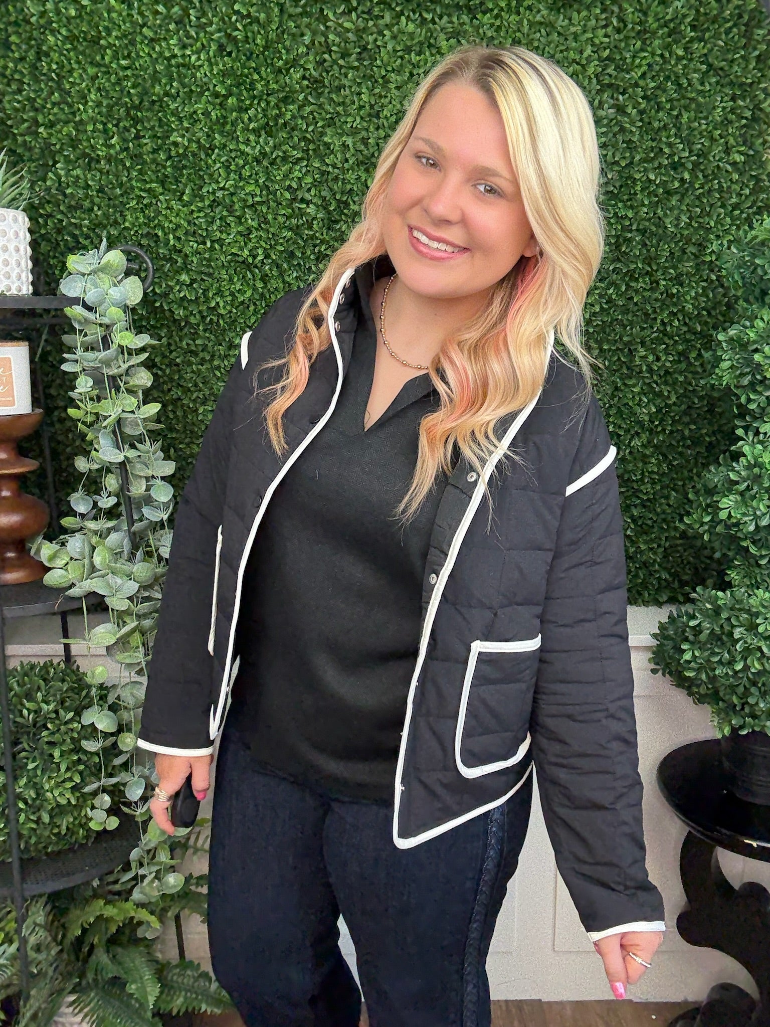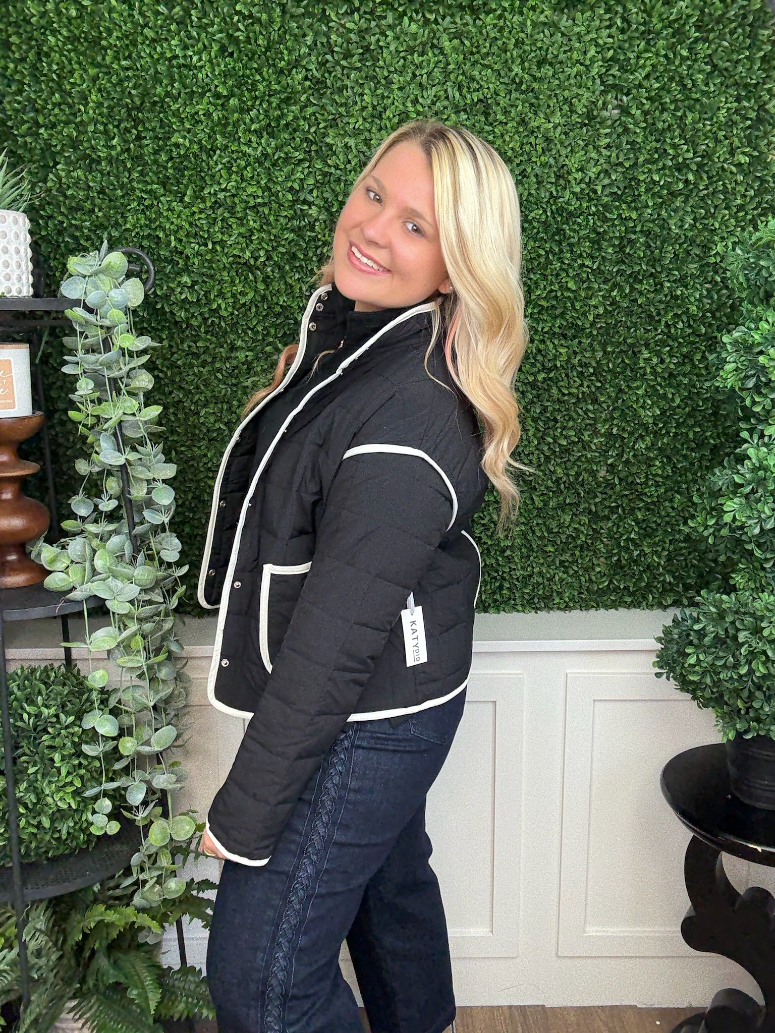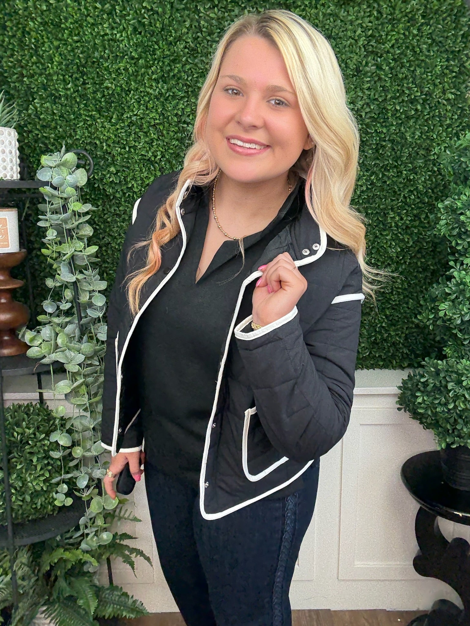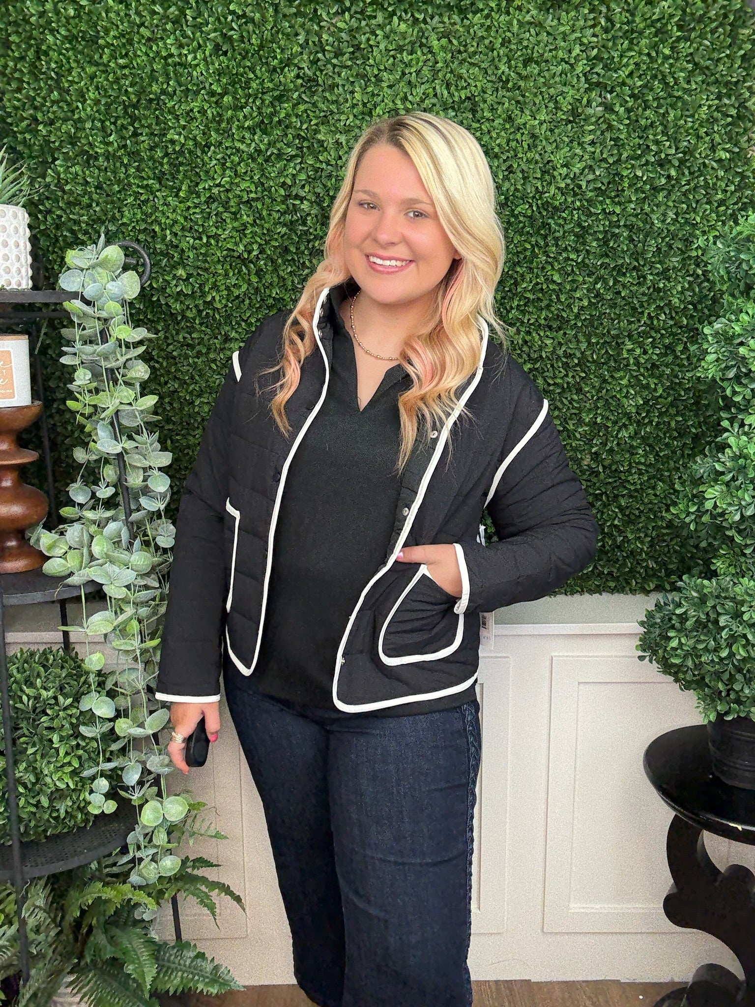 This black quilted jacket with white piping offers a sleek, modern look with a touch of contrast detail. Its lightweight warmth and stylish design make it a cute and versatile addition to your wardrobe.