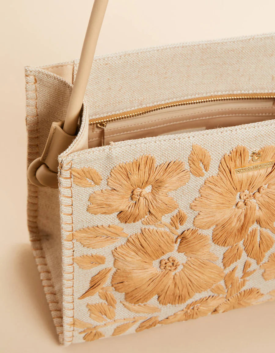 Made in a luxurious cotton and jute blend, our Raya Straw Tote is embroidered in a neutral raffia floral design to create a unique look only this intricate technique can provide. Inside its zipper top, you'll find 2 slip pockets and 1 zip pocket in this medium size tote.