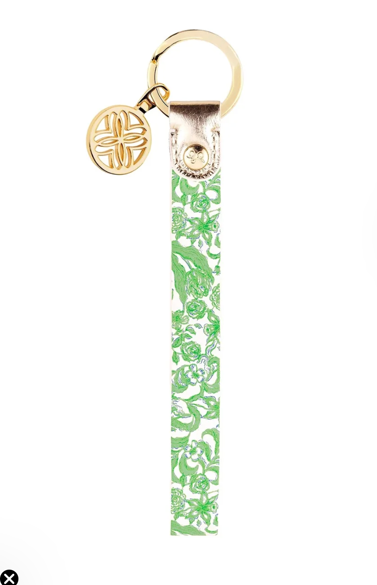 Deck out your keys the Lilly way with the strap keychain in Daffodil Hill. This keychain bracelet allows you to be hands-on at all times, so no worries about misplacing your keys when you have to carry in groceries, or shopping bags, or grab a little one out of the car. Featuring a two-sided design and gold metal hardware, this colorful accessory makes a statement for its convenience and flair!