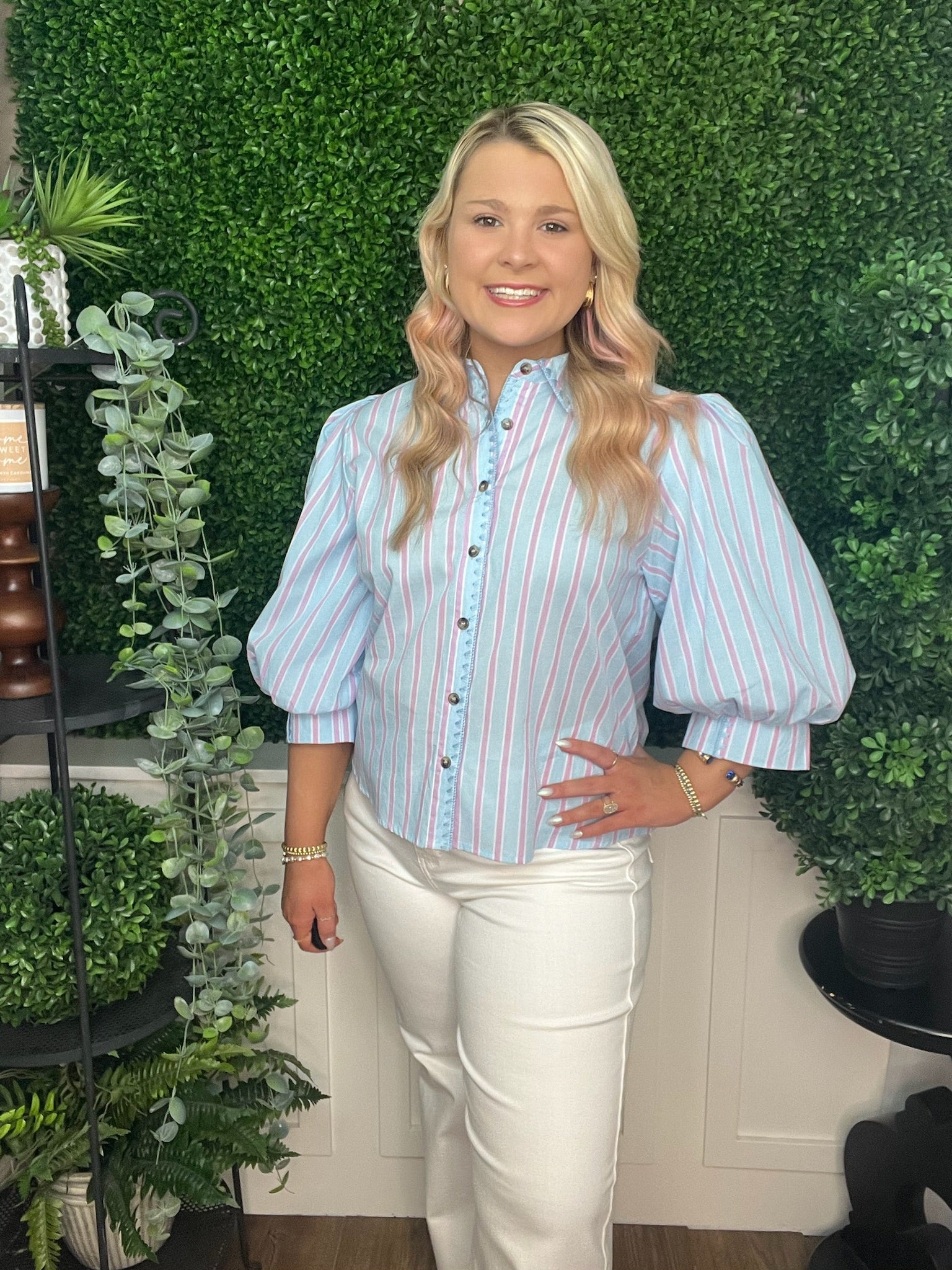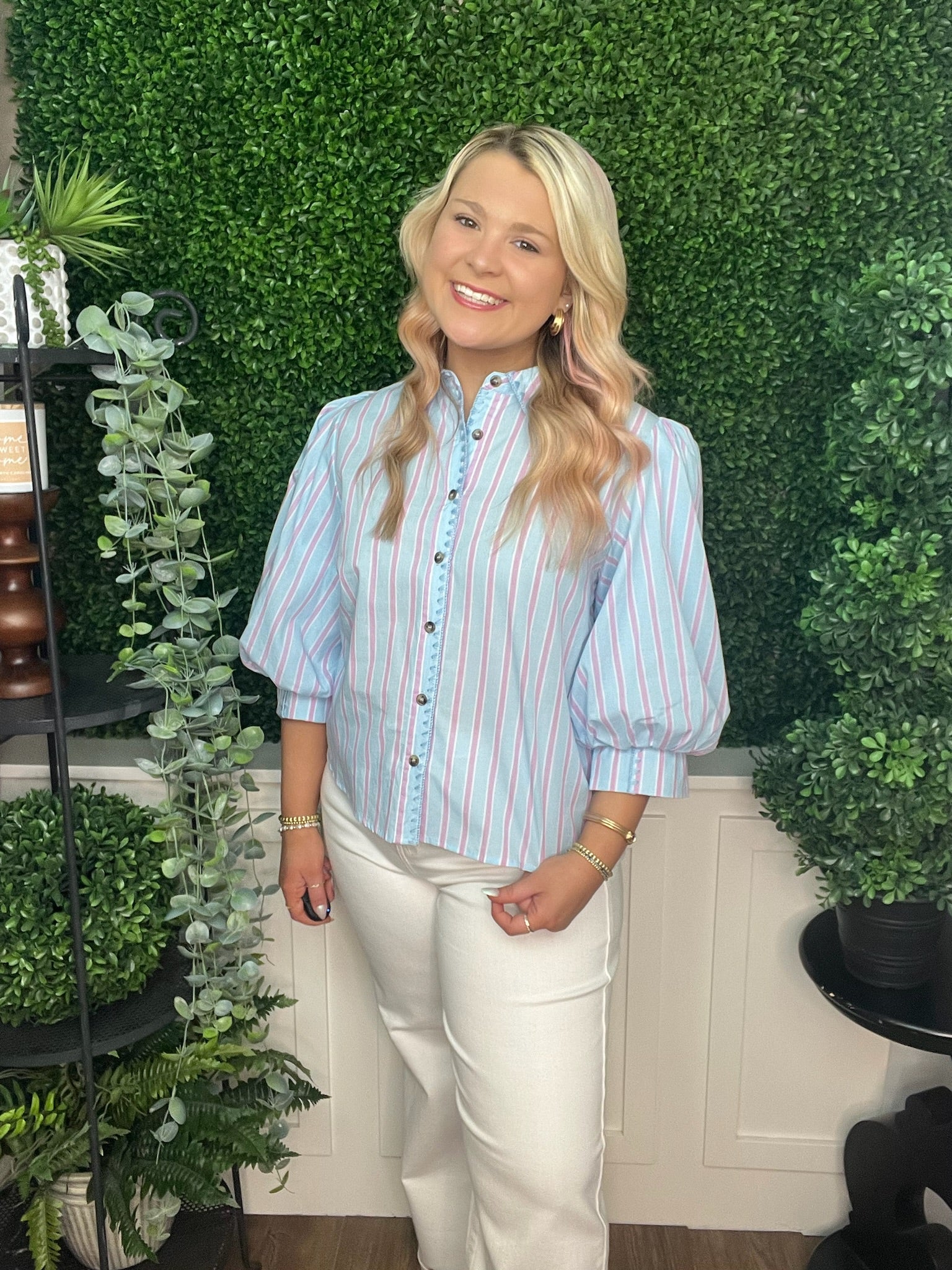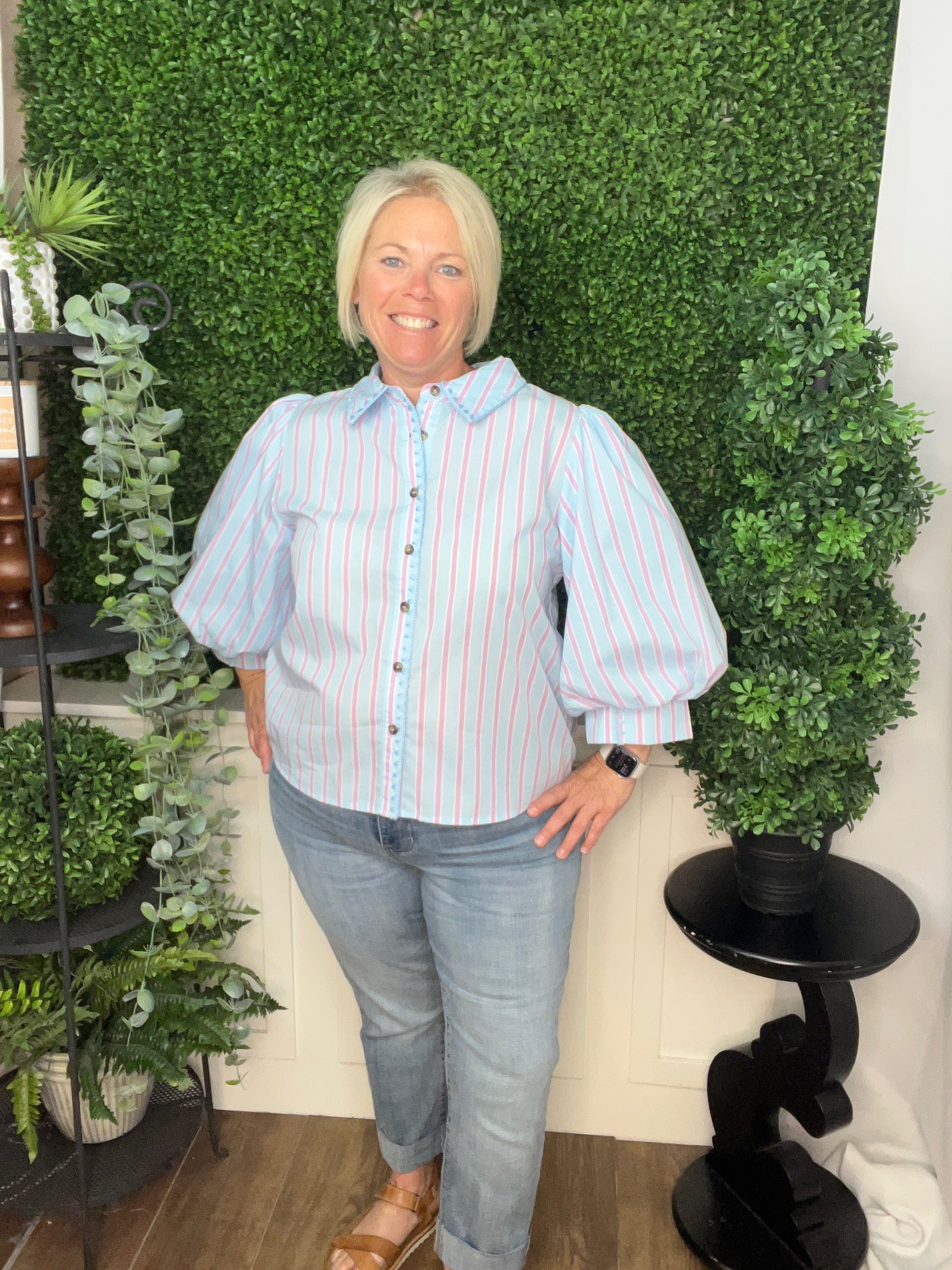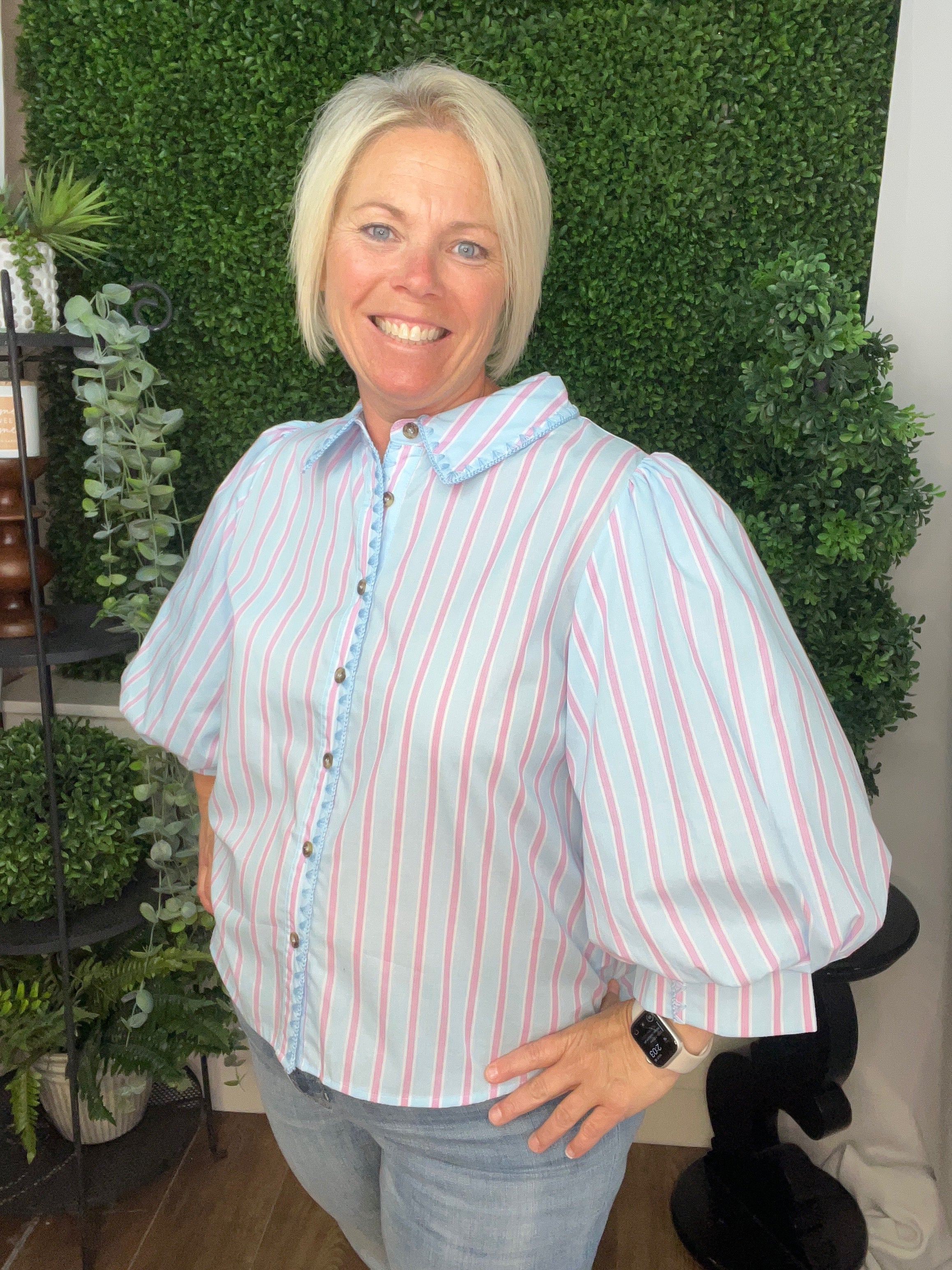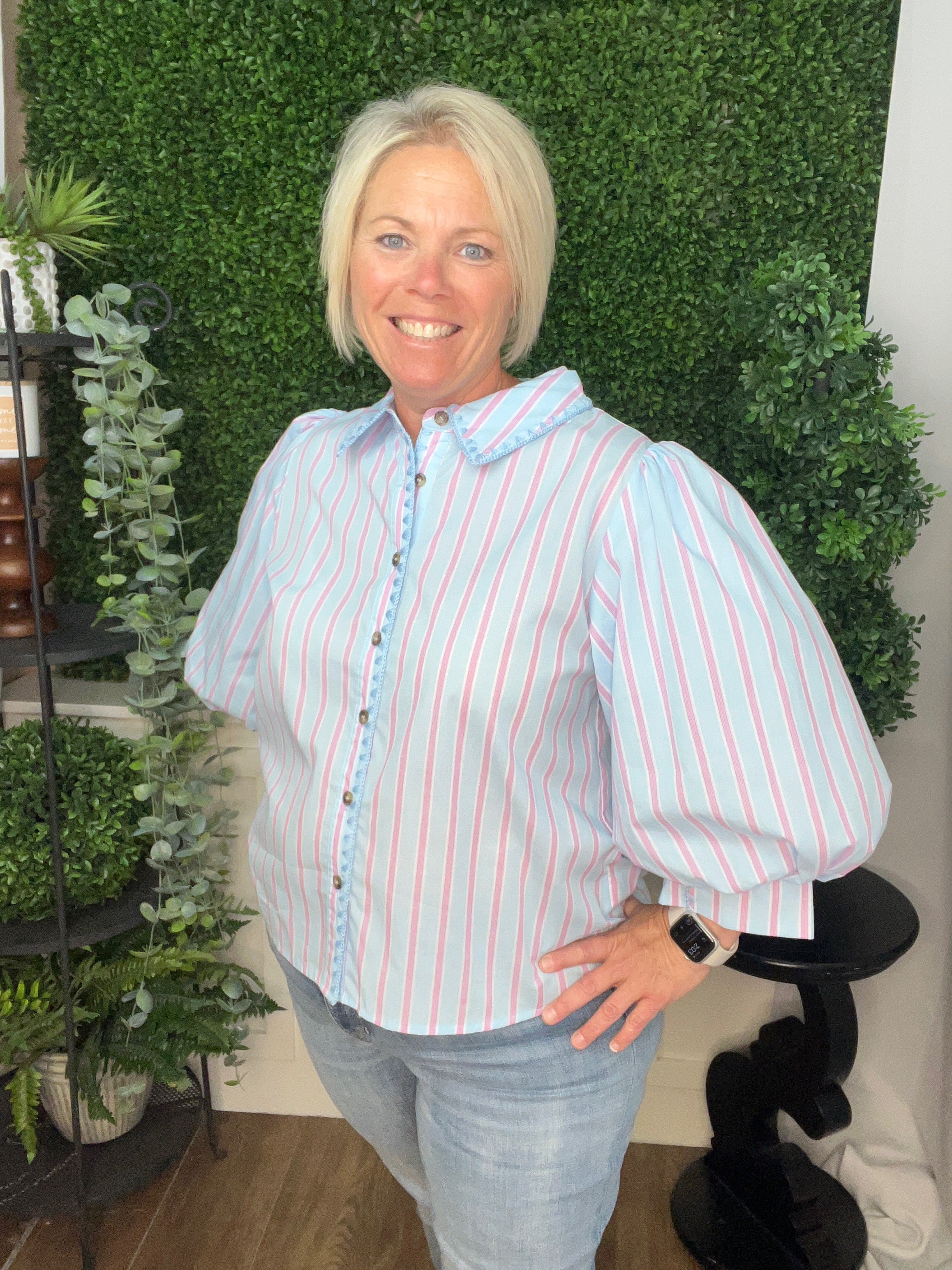 This blue collared top features stylish stripes, adding a touch of sophistication to your wardrobe. The collared neck adds a classic touch while the striped design offers a modern twist. Made with quality materials, this top is perfect for any occasion or setting. Elevate your style effortlessly with this versatile piece.