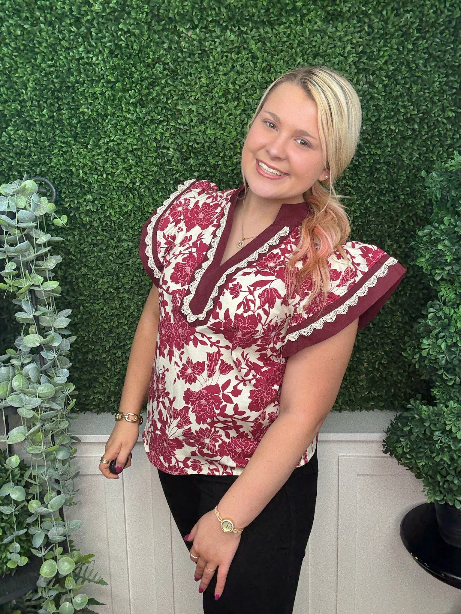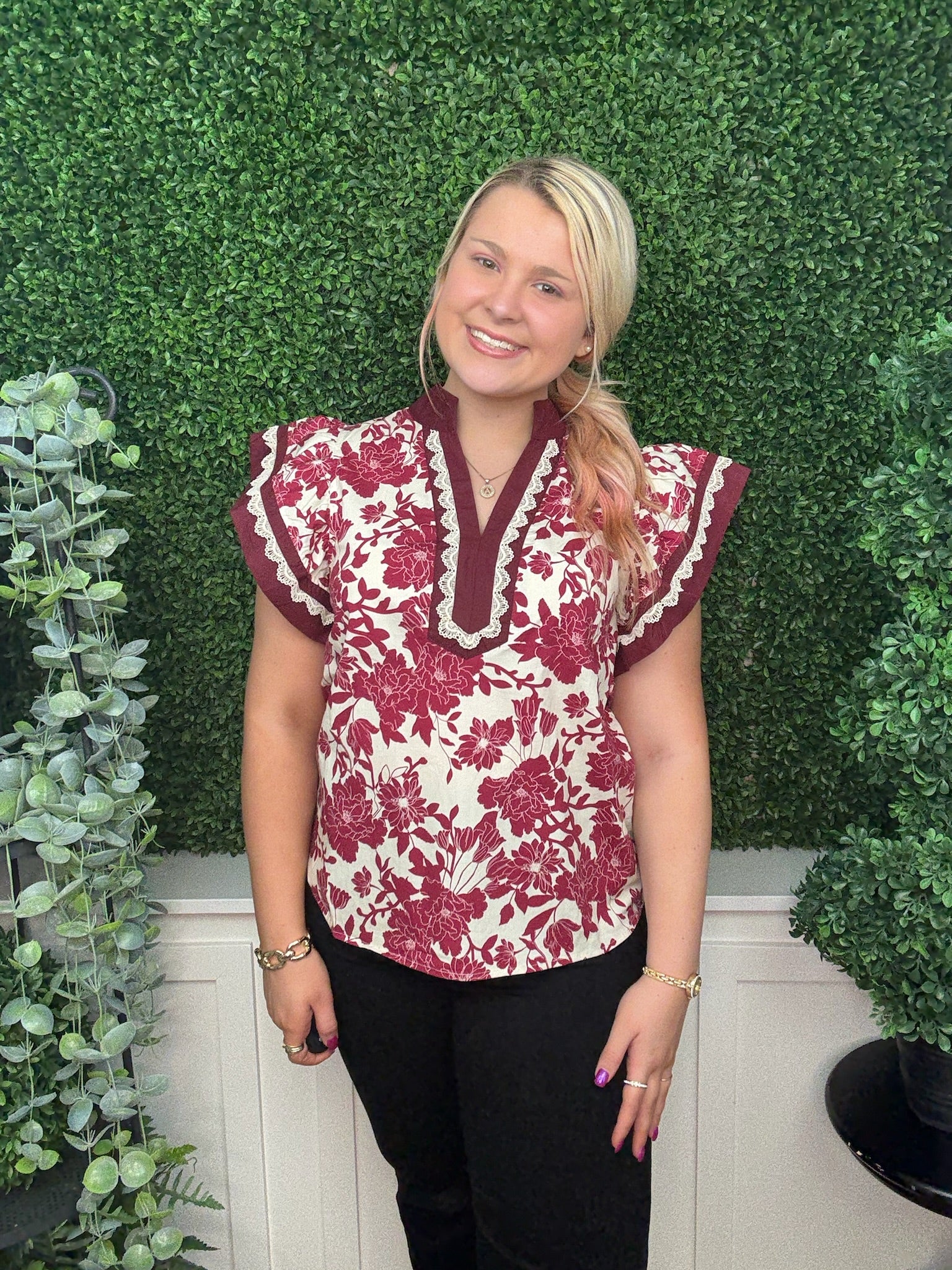 This burgundy top features delicate floral prints and flutter sleeves that add a soft, feminine touch. Its lightweight fabric and flowing design make it perfect for a cute, stylish look that’s comfortable all day. Pair it with your favorite jeans or skirts for an effortlessly charming outfit.