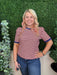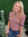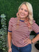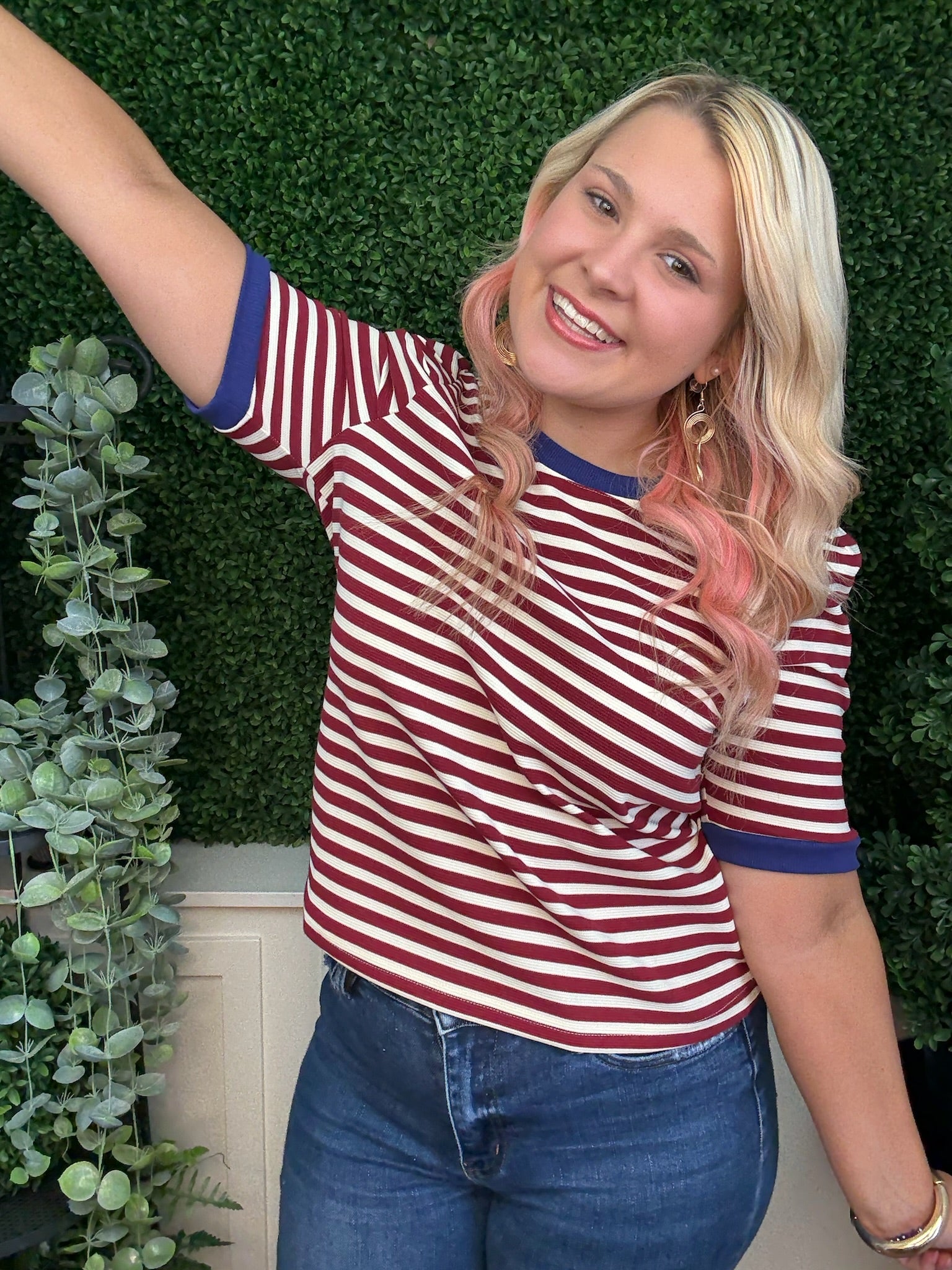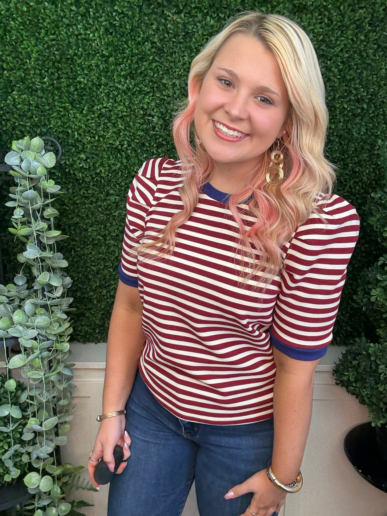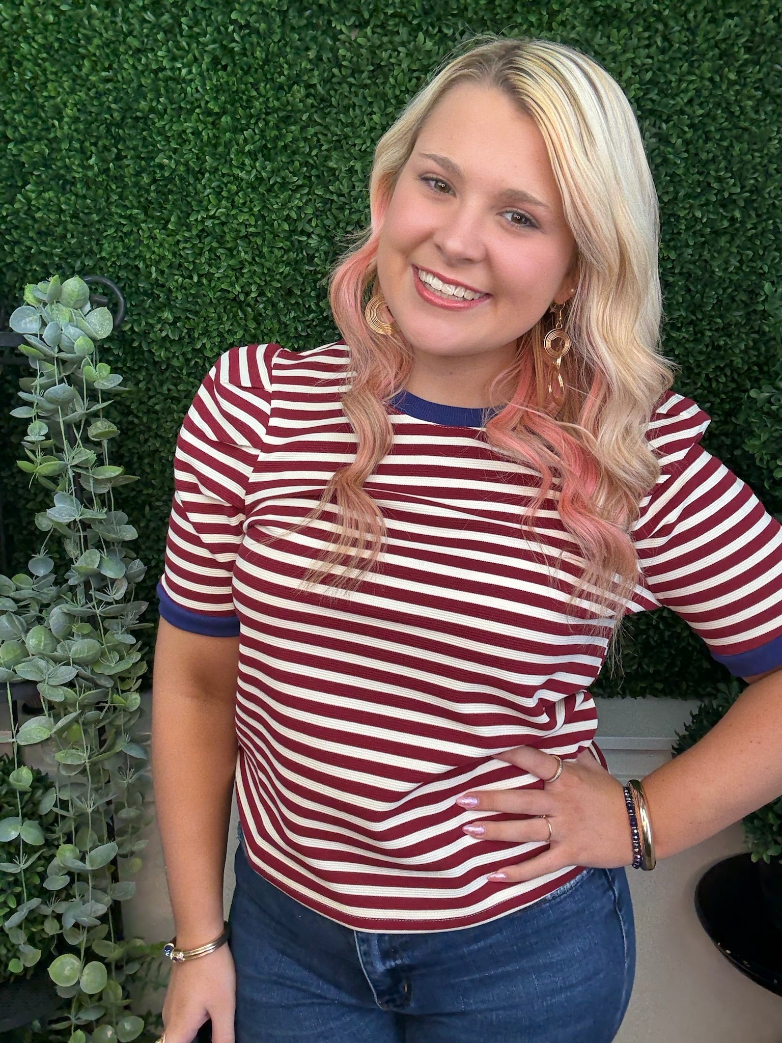 Stripe pattern short sleeve pullover top featuring contrast accent band detail. Unlined. Knit. Non-sheer. Lightweight.