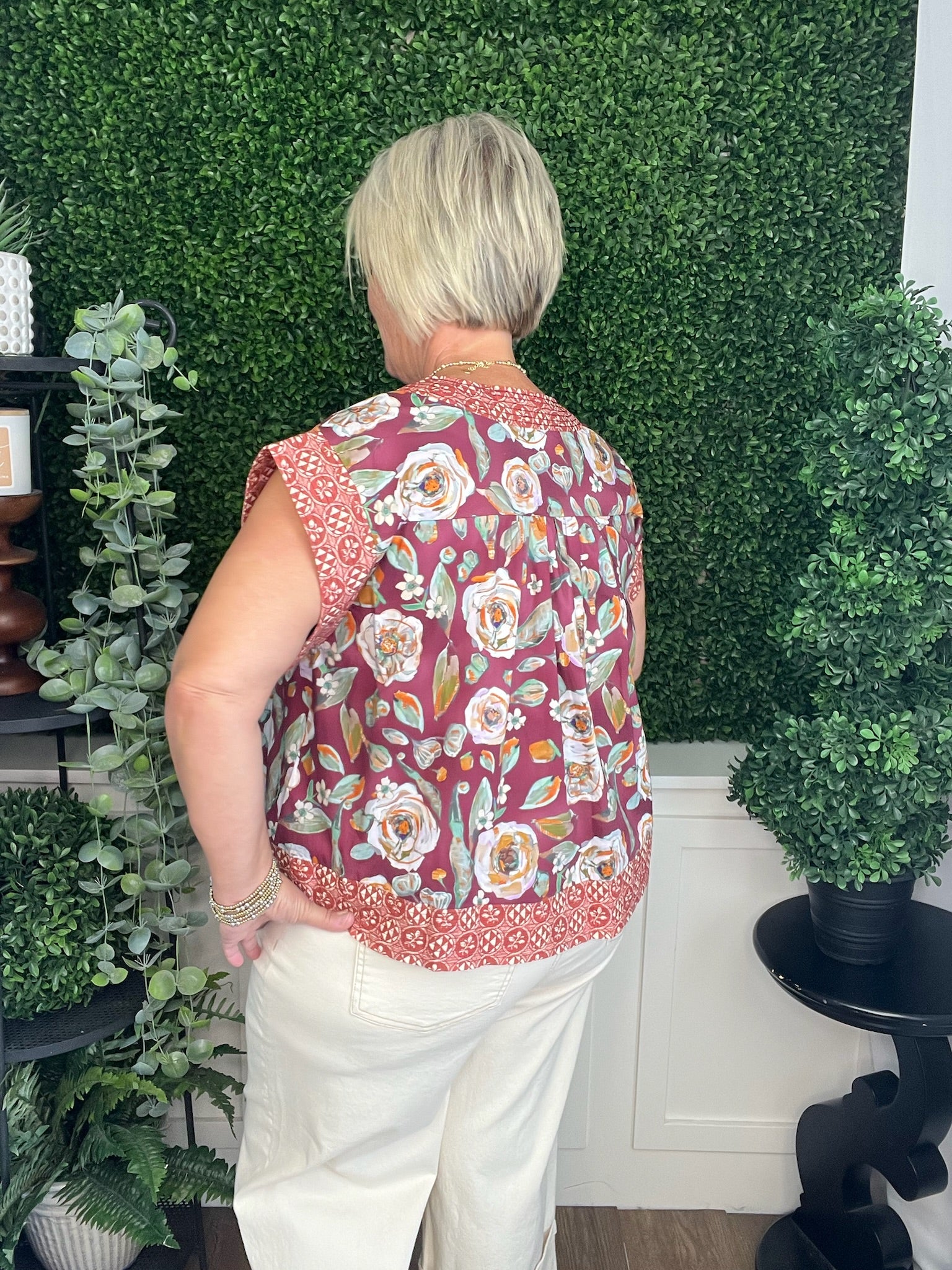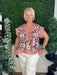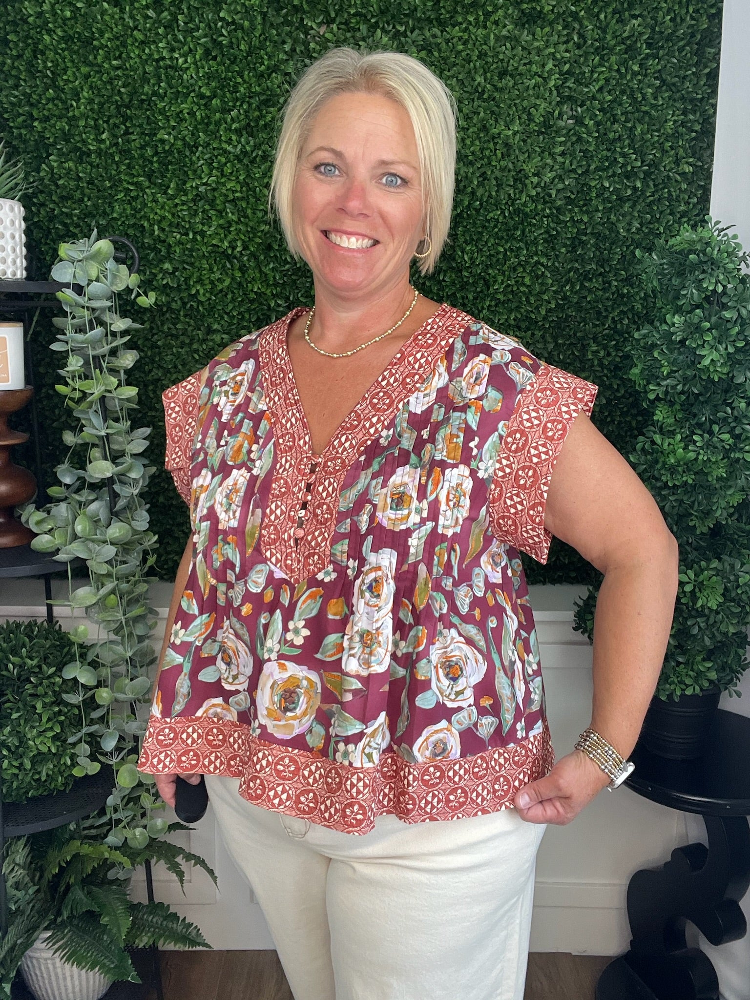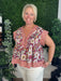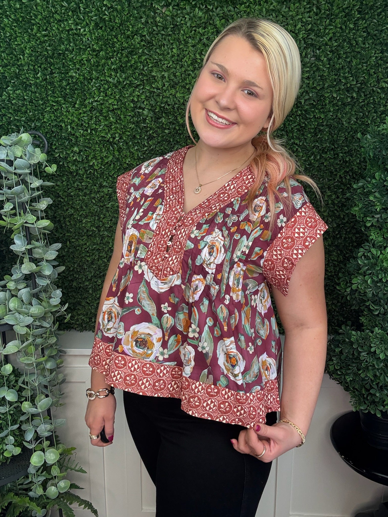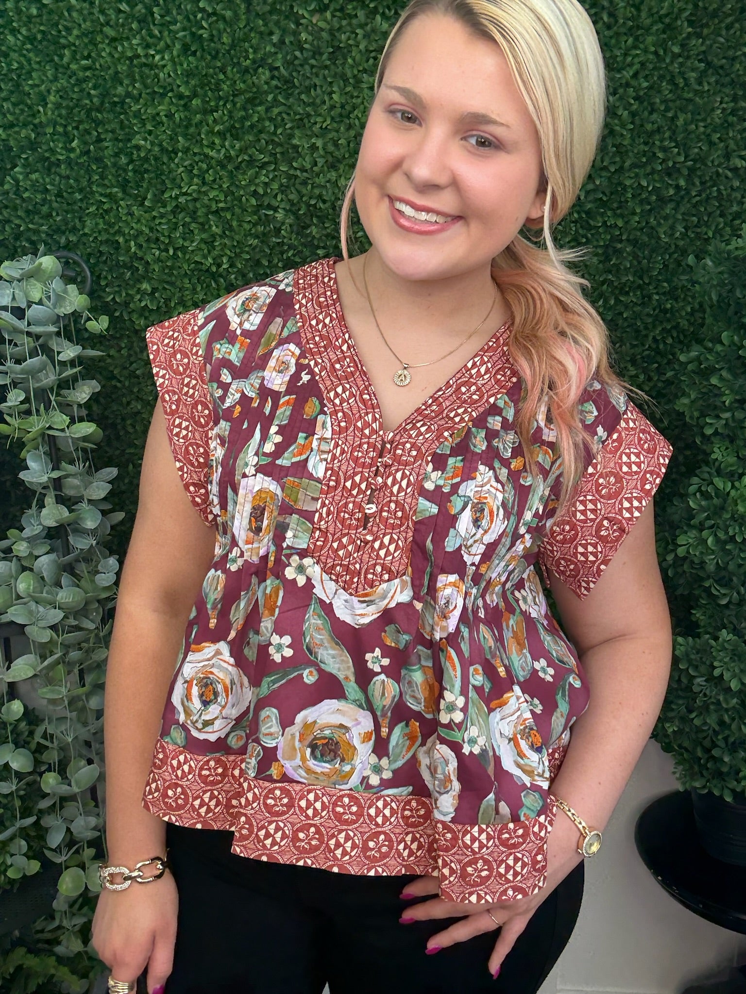 This burgundy multi-print pintuck top offers a sophisticated blend of patterns with delicate pintuck detailing for added texture. Its refined design creates a polished look perfect for dressy occasions, making it an elegant choice to elevate your wardrobe with subtle yet striking style.