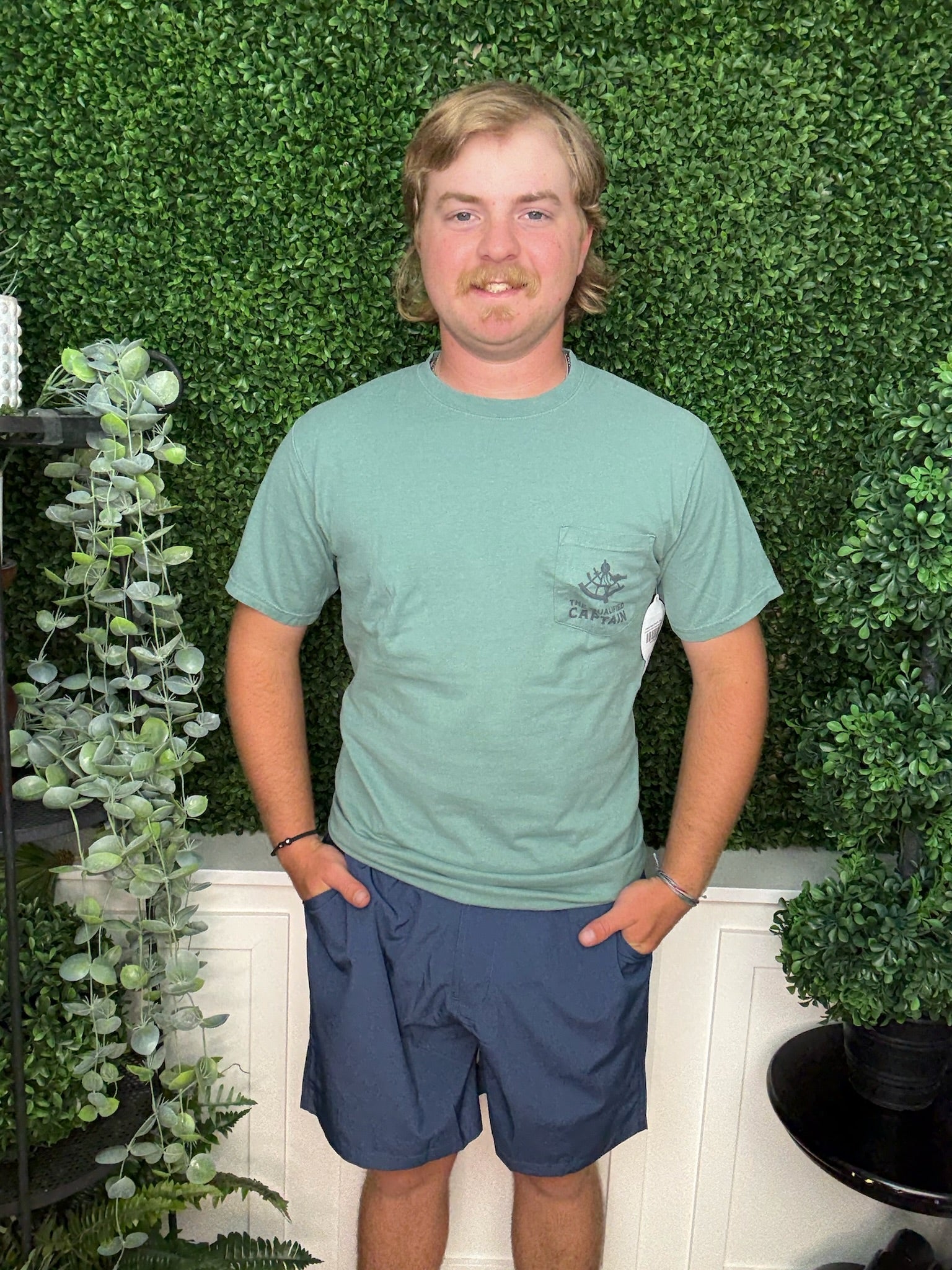 This UNCHARTED WATERS POCKET TEE in cypress green offers a stylish, comfortable fit with short sleeves and a round neck. Perfect for everyday wear, the green color and pocket tee design add a unique touch. Expertly crafted for those who want to stand out in uncharted waters.