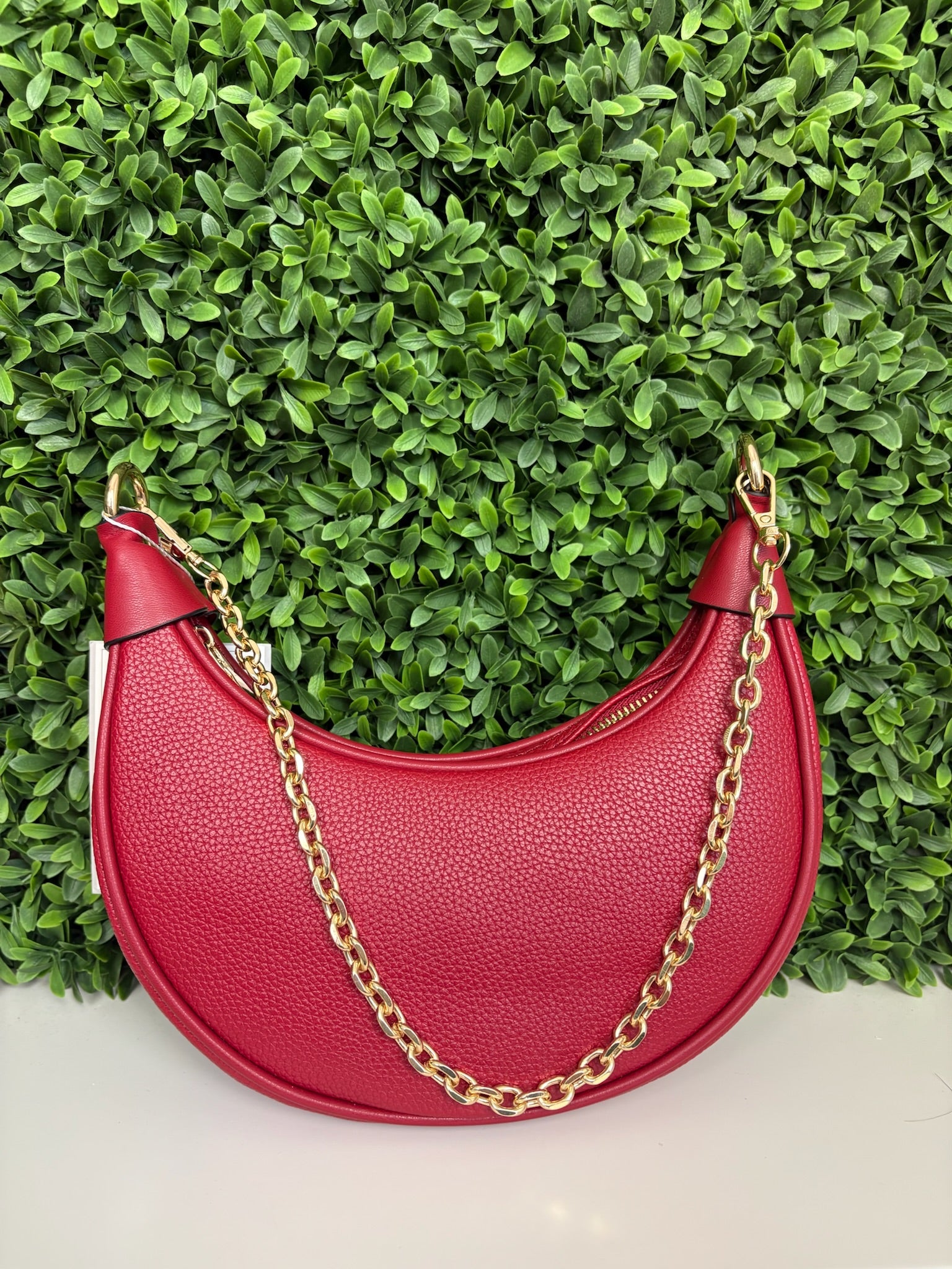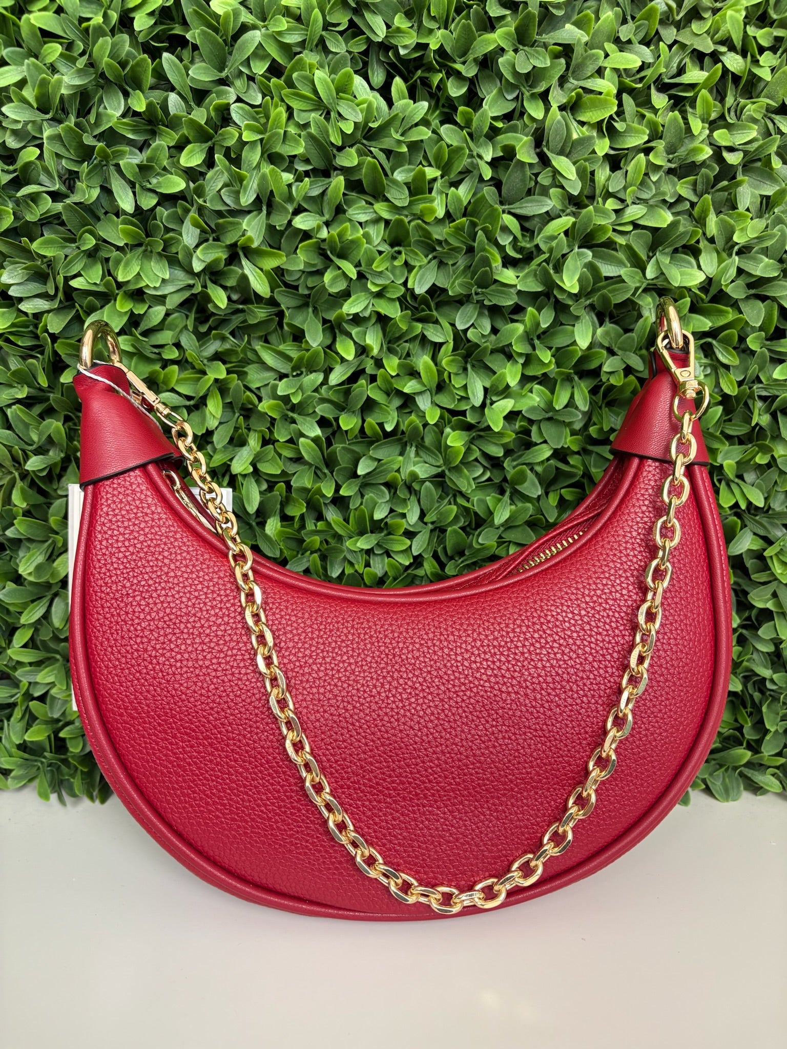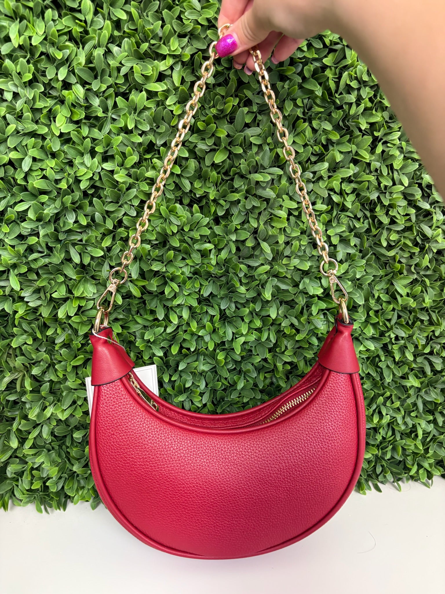 The Zora Moon shoulder bag in dark red combines a rich color with a sleek design for a cute and stylish accessory. Its compact size and comfortable strap make it perfect for carrying essentials while adding a pop of color to any outfit.